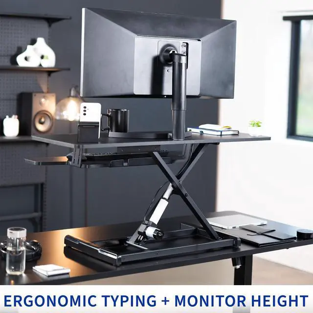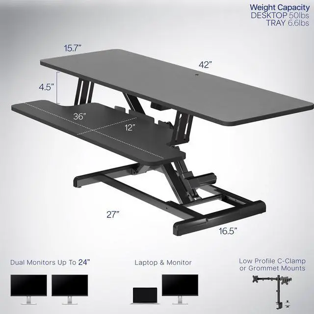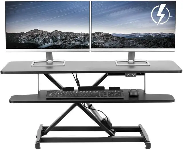Enhance your work experience with the Black 42 Electric Desk Riser (DESK-VE42B) from VIVO! Transitioning between sitting and standing throughout the long work day provides numerous health benefits such as increased blood flow and reduced tension. The solidly built desktop supports up to 50 lbs, easily holding multiple monitors or laptop and monitor combinations. It features a smooth, electric lift that allows simple height adjustment at the push of a button. The dual-tiered design lets you customize your work area to create the workflow you need, and the keyboard tray is removable using the included hex tool. All hardware and instructions are provided so you can get your new desk riser assembled in no time!