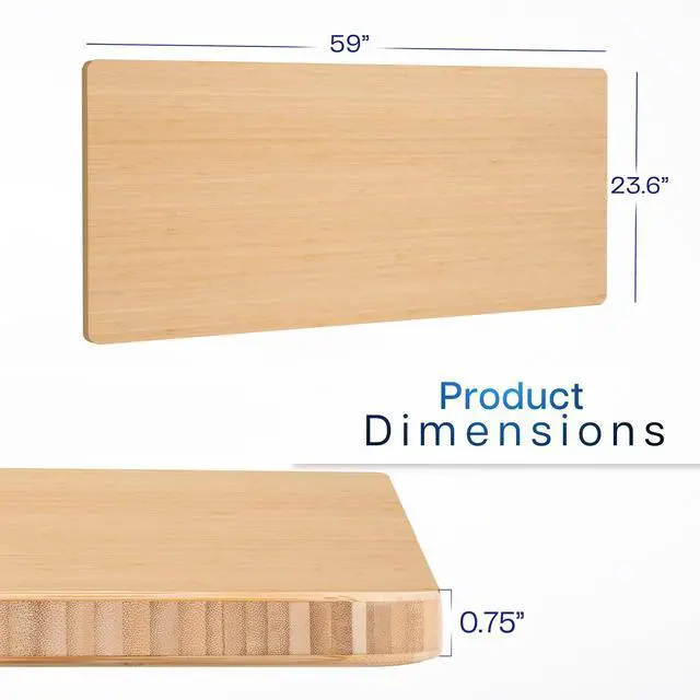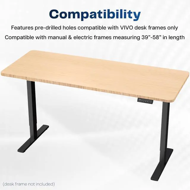 Find the perfect table top solution for your standing desk frame with DESK-TOP60O from VIVO! Featuring solid bamboo in a natural light color, this product provides the finishing touch to your adjustable workstation. Go from sitting to standing with all of your equipment and accessories safely resting on this sturdy surface. Compatible with both manual and electric frames measuring 39 to 58 in length, this table top gives you options! Whether you're creating your very first sit-to-stand workstation or you need a replacement part, this desk surface was built to last! All hardware and instructions are provided to get your new platform attached to your current desk frame in no time!