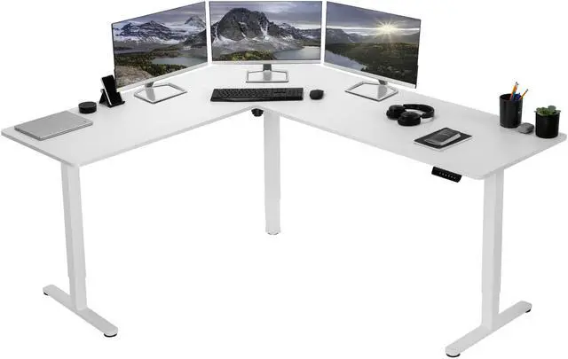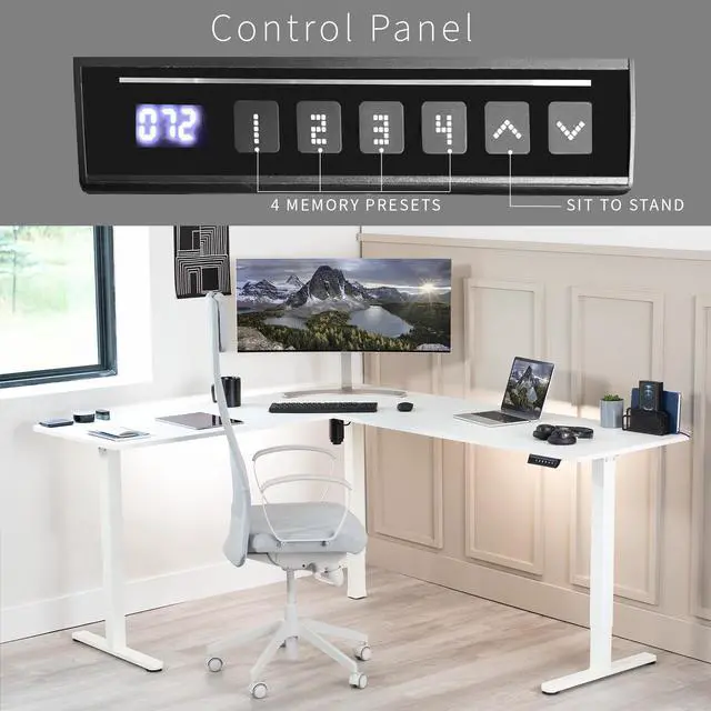 Enjoy a spacious workstation that accommodates an active work life with the White 75 x 63 Corner Electric Desk (DESK-E3CTW-75) from VIVO! Periodically standing throughout the long work day can help relieve tension on the neck, back, and shoulders, as well as increase blood flow and reduce stress. Enjoy being able to stand up in seconds with this sturdy l-shaped desk featuring a single motor lift system for smooth height transitions, memory control panel for customizable settings, and solid legs supporting up to 176 lbs. All hardware and instructions are provided for assembly, so you can experience your own spacious work area that helps you stay organized and think on your feet!