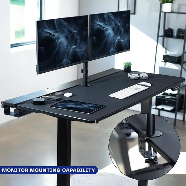 Transform your workstation to accommodate an active work life with the Black 60 x 30 Electric Desk with Concealed Cable Table Top and Full-Size Pad (DESK-KIT-1B6-P3B) from VIVO! Find that healthy balance between sitting and standing throughout the long work day with electric height adjustment, telescopic legs, and a simple push-button controller featuring memory presets. With a frame constructed of solid steel, this desk supports up to 176 lbs and is built to last. The table top features a built-in rear cable management system along with a full-size desk pad for edge-to-edge protection. It comes in 3 sections for easy assembly, and all hardware is provided to get your desk frame put together and installed to your desktop in no time!