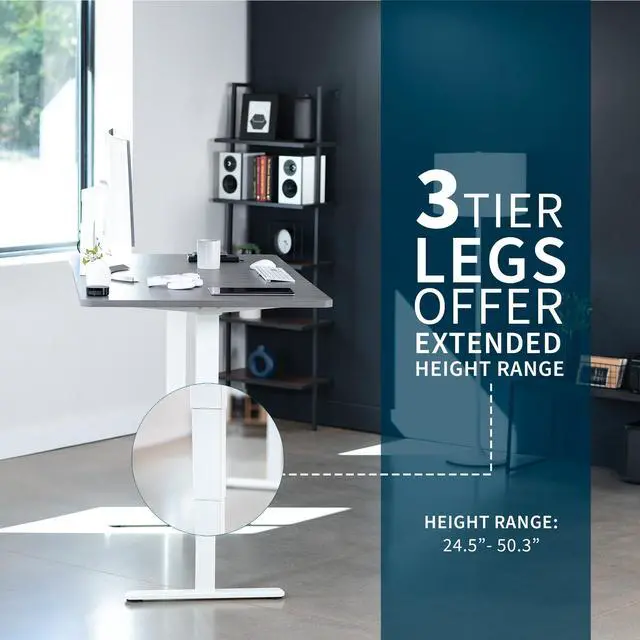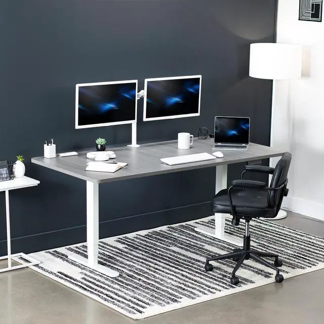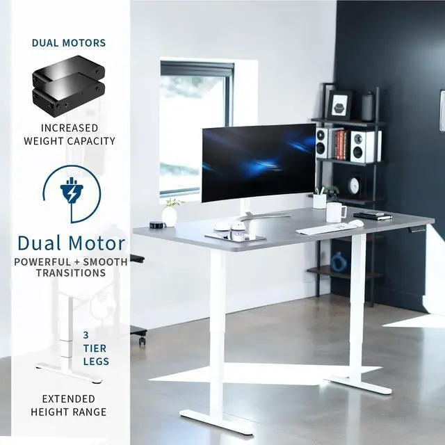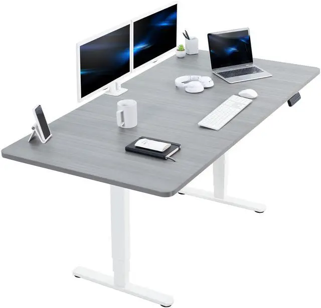 Transform your workstation to accommodate an active work life with the Dark Gray / White 71 x 36 Electric Desk (DESK-KIT-2W7G-36) from VIVO! Finding a healthy balance between sitting and standing throughout the long work day is made possible with electric height adjustment, telescopic legs, and a simple push button controller featuring 3 memory presets. The spacious table top provides room for dual monitor setups and important supplies so you can organize your workspace to fit your preferred layout. With a frame constructed of solid steel, this desk supports up to 220 lbs and is built to last. All hardware and instructions are provided, so you can get your new workstation assembled and taking you to new heights!