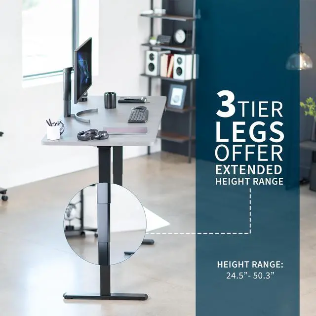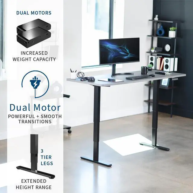 Transform your workstation to accommodate an active work life with the Dark Gray / Black 71" x 30" Electric Desk (DESK-KIT-2B7G) from VIVO! Finding a healthy balance between sitting and standing throughout the long work day is made possible with electric height adjustment, telescopic legs, and a simple push button controller featuring 3 memory presets. The spacious table top provides room for dual monitor setups and important supplies so you can organize your workspace to fit your preferred layout. With a frame constructed of solid steel, this desk supports up to 220 lbs and is built to last. All hardware and instructions are provided, so you can get your new workstation assembled and taking you to new heights!