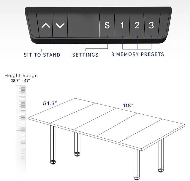 Transform your workstation to accommodate an active work life with the Black 118" x 55" Dual Motor Electric 4-Leg Desk with Square Corner Top (DESK-KIT-405B) from VIVO! Finding a healthy balance between sitting and standing throughout the long work day is made possible with electric height adjustment, telescopic legs, and a simple push-button controller featuring memory presets. The extra spacious table provides room for multi-monitor displays and important supplies to create a conference room setup or expansive workstation. With a 4-leg frame constructed of solid steel and sturdy particle board tops, this desk supports up to 195 lbs and is built to last. All hardware and instructions are provided, so you can get your new workstation assembled and experience your very own standing desk in no time!