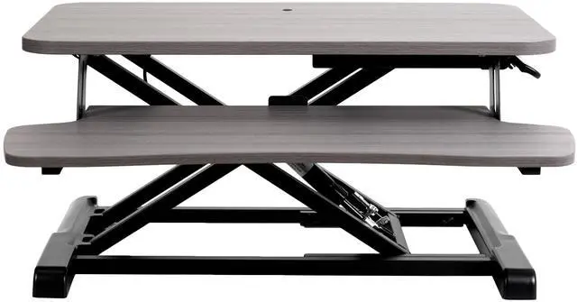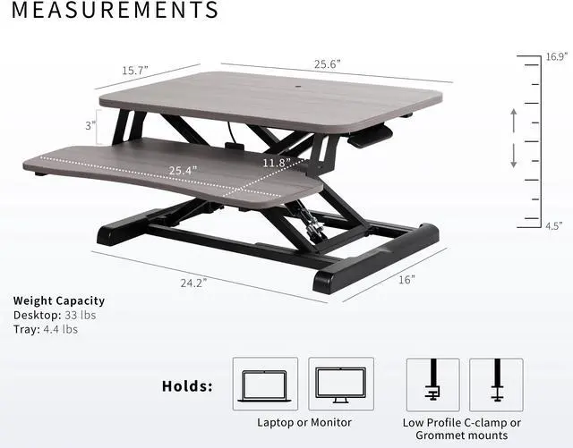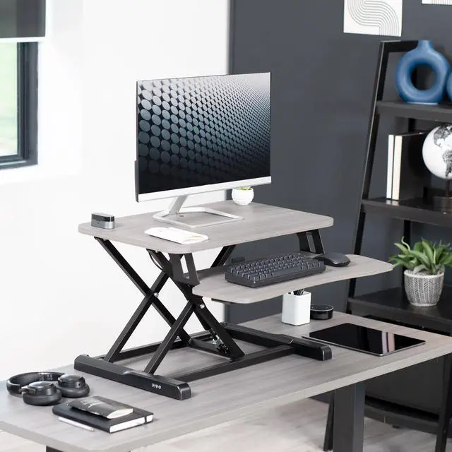 Enhance your work experience with the Gray / Black 26" Compact Desk Riser (DESK-V026KG) from VIVO! Transitioning between sitting and standing throughout the long work day provides numerous health benefits for the body such as increased blood flow and reduced aches and pains. This solidly built desktop supports up to 33 lbs, easily holding your monitor or laptop with ease. It also features pneumatic spring lift that allows simple and smooth height adjustment (4.5 to 16.9) at the squeeze of a handle. The dual-tiered design allows you to customize your work area to create the workflow you need, and the keyboard tray is removable using the provided hex tool. All hardware and instructions are provided so you can get your new desk riser assembled and workspace organized in no time!