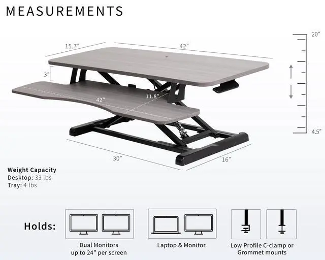 Enhance your work experience with the Gray / Black 42 Desk Riser (DESK-V042KG) from VIVO! Transitioning between sitting and standing throughout the long work day provides numerous health benefits for the body such as increased blood flow and reduced aches and pains. This solidly built desktop supports up to 33 lbs, easily holding multiple monitors or laptop and monitor combinations. It also features pneumatic spring lift that allows simple and smooth height adjustment (4.5 to 20) at the squeeze of a handle. The dual-tiered design allows you to customize your work area to create the workflow you need, and the keyboard tray is removable using the provided hex tool. All hardware and instructions are provided so you can get your new desk riser assembled and workspace organized in no time!