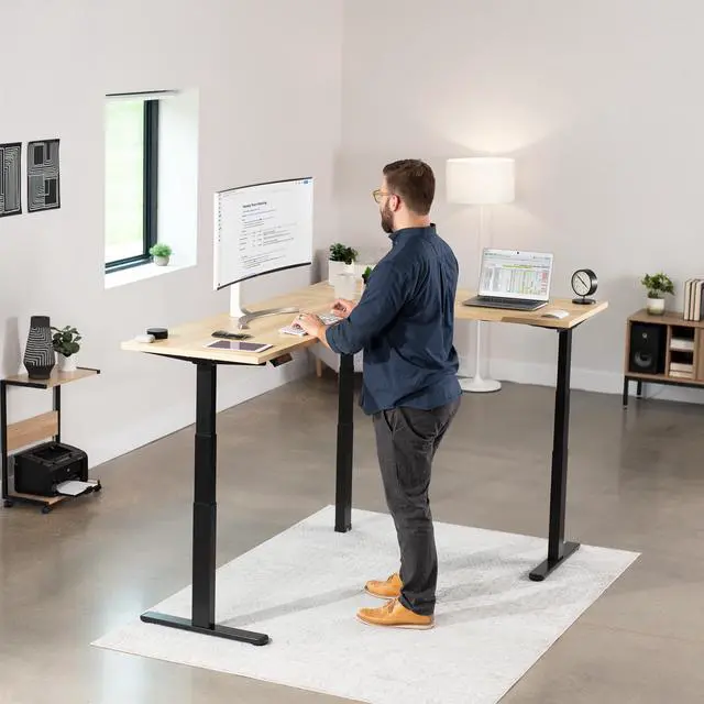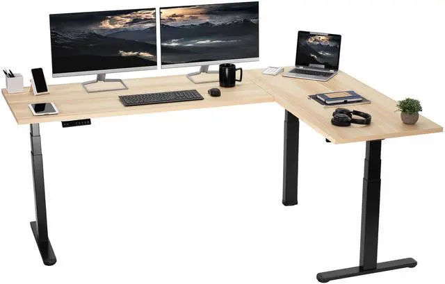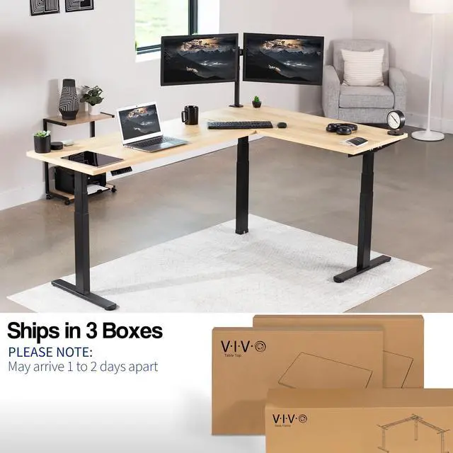 Enjoy a spacious workstation that accommodates an active work life with the Light Wood / Black L-Shaped 78" x 55" Electric Desk with Square Corner Edge Top (DESK-KIT-3E5SBC) from VIVO! Enjoy being able to stand up in seconds with this sturdy corner desk featuring a multi-motor lift system for smooth height transitions, a memory control panel for customizable settings, and solid steel legs supporting up to 300 lbs. The cable management system ensures that cords and cables are neatly organized for a tidy workspace that encourages concentration. All hardware and instructions are included for assembly. Dont wait to experience your own spacious work area that helps you stay organized and think on your feet!