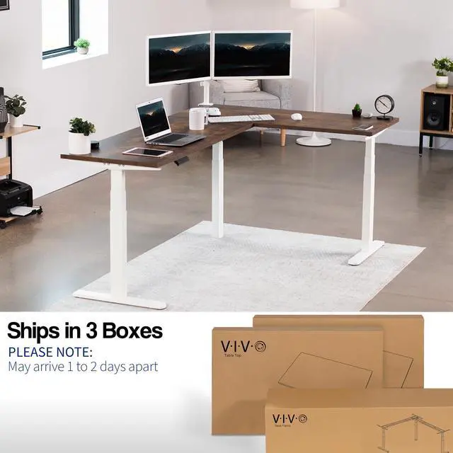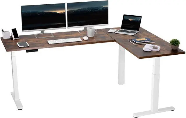 Enjoy a spacious workstation that accommodates an active work life with the Vintage Brown / White L-Shaped 78" x 55" Electric Desk with Square Corner Edge Top (DESK-KIT-3E5SWN) from VIVO! Enjoy being able to stand up in seconds with this sturdy corner desk featuring a multi-motor lift system for smooth height transitions, a memory control panel for customizable settings, and solid steel legs supporting up to 300 lbs. The cable management system ensures that cords and cables are neatly organized for a tidy workspace that encourages concentration. All hardware and instructions are included for assembly. Dont wait to experience your own spacious work area that helps you stay organized and think on your feet!