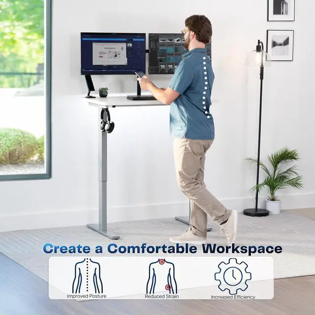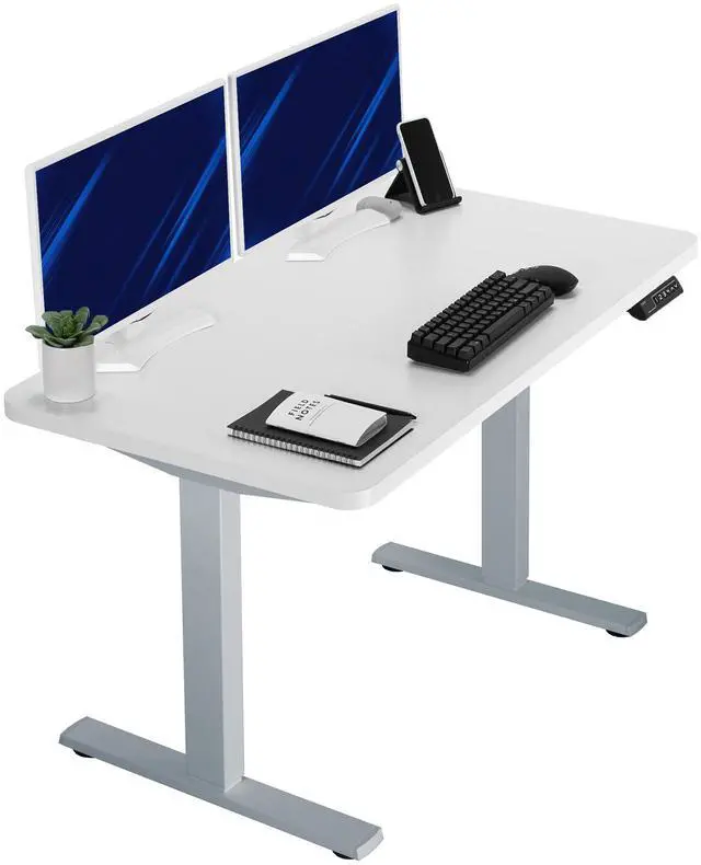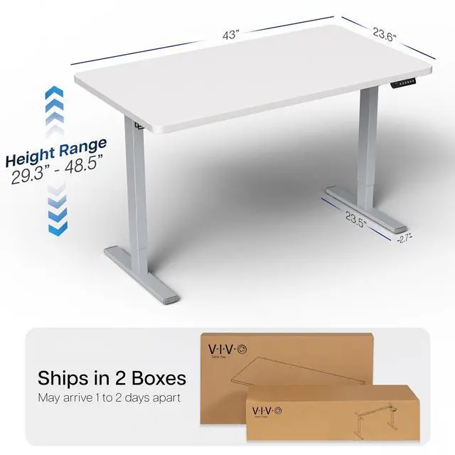 Transform your workstation to accommodate an active work life with the White / Gray 43 x 24 Electric Desk (DESK-KIT-1G4W) from VIVO! Finding a healthy balance between sitting and standing throughout the long work day is made possible with electric height adjustment, telescopic legs, and a simple push button controller featuring 4 memory presets. The space-efficient table top provides room for dual monitor setups and important supplies so you can organize your workspace to fit your preferred layout. With a frame constructed of solid steel, this desk supports up to 220 lbs and is built to last. Cable management clips keep cords and cables neatly organized and hidden from view for a tidy workspace that encourages concentration. All hardware and instructions are provided, so you can get your new workstation assembled and experience your very own standing desk in no time!