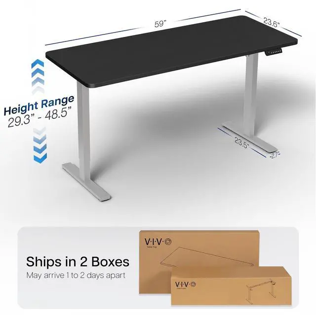 Transform your workstation to accommodate an active work life with the Black / Gray 60" x 24" Electric Desk (DESK-KIT-1G6B) from VIVO! Finding a healthy balance between sitting and standing throughout the long work day is made possible with electric height adjustment, telescopic legs, and a simple push-button controller featuring 4 memory presets. The spacious table top provides room for dual monitor setups and important supplies so you can organize your workspace to fit your preferred layout. With a frame constructed of solid steel, this desk supports up to 220 lbs and is built to last. Cable management clips keep cords and cables neatly organized and hidden from view for a tidy workspace that encourages concentration. All hardware and instructions are provided, so you can get your new workstation assembled and experience your very own standing desk in no time!