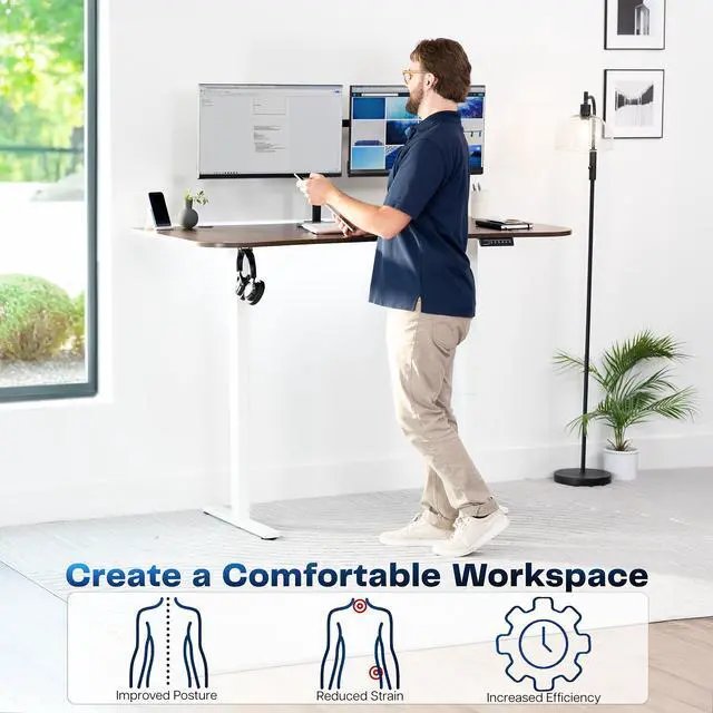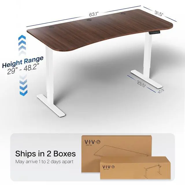 Transform your workstation to accommodate an active work life with the Dark Walnut / White 63" x 32" Electric Desk (DESK-KIT-1W1D) from VIVO! Find that healthy balance between sitting and standing throughout the long work day with electric height adjustment, telescopic legs, and a simple push-button controller featuring 4 memory presets. With a frame constructed of solid steel, this desk supports up to 220 lbs and is built to last. The table top comes packaged in 3 sections, and all hardware is provided to get your desk frame put together and installed to your desktop in no time!