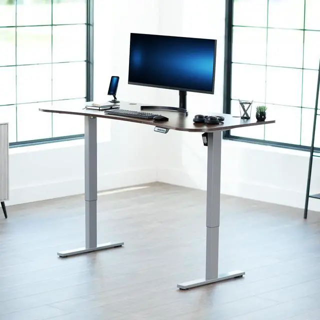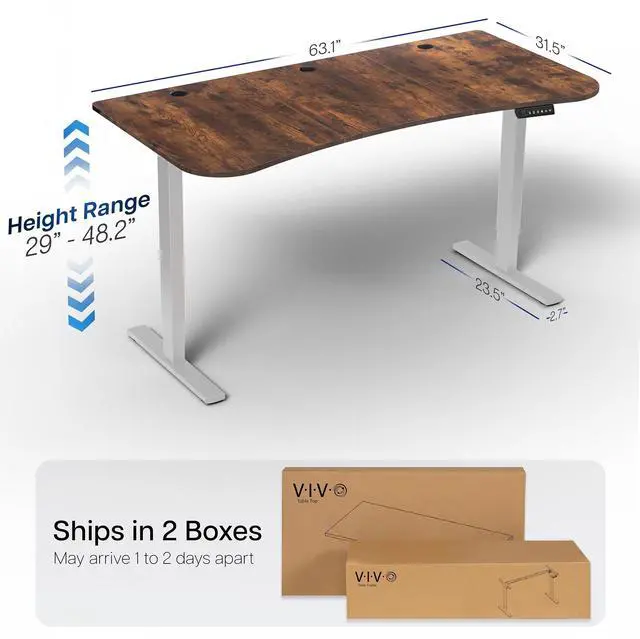 Transform your workstation to accommodate an active work life with the Vintage Brown / Gray 63" x 32" Electric Desk (DESK-KIT-1G1N) from VIVO! Find that healthy balance between sitting and standing throughout the long work day with electric height adjustment, telescopic legs, and a simple push-button controller featuring 4 memory presets. With a frame constructed of solid steel, this desk supports up to 220 lbs and is built to last. The table top comes packaged in 3 sections, and all hardware is provided to get your desk frame put together and installed to your desktop in no time!