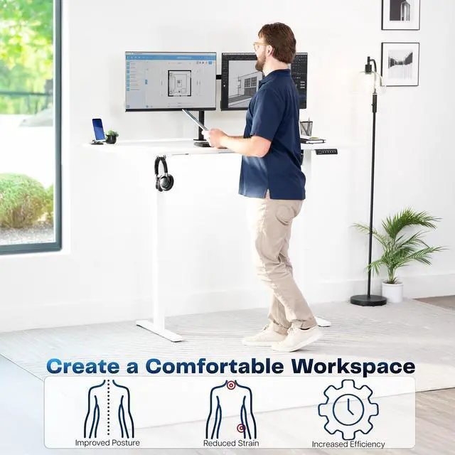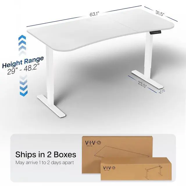 Transform your workstation to accommodate an active work life with the White 63" x 32" Electric Desk (DESK-KIT-1W1W) from VIVO! Find that healthy balance between sitting and standing throughout the long work day with electric height adjustment, telescopic legs, and a simple push-button controller featuring 4 memory presets. With a frame constructed of solid steel, this desk supports up to 220 lbs and is built to last. The table top comes packaged in 3 sections, and all hardware is provided to get your desk frame put together and installed to your desktop in no time!