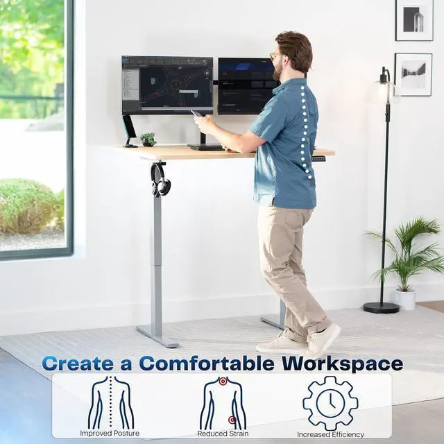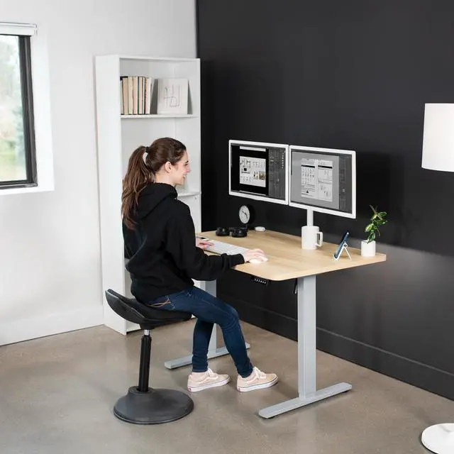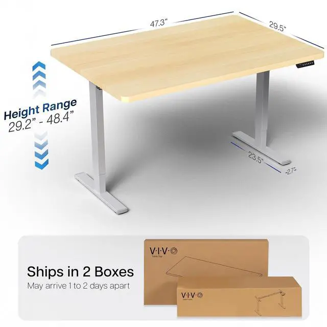 Transform your workstation to accommodate an active work life with the Light Wood / Gray 48" x 30" Electric Desk (DESK-KIT-1G5C) from VIVO! Finding a healthy balance between sitting and standing throughout the long work day is made possible with electric height adjustment, telescopic legs, and a simple push-button controller featuring 4 memory presets. The extra deep table top provides room for dual-monitor setups and important supplies so you can organize your workspace to fit your desired layout. With a frame constructed of solid steel, this desk supports up to 220 lbs and is built to last. All hardware and instructions are provided, so you can get your new workstation assembled and experience your very own standing desk in no time!