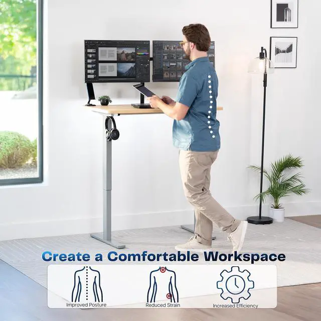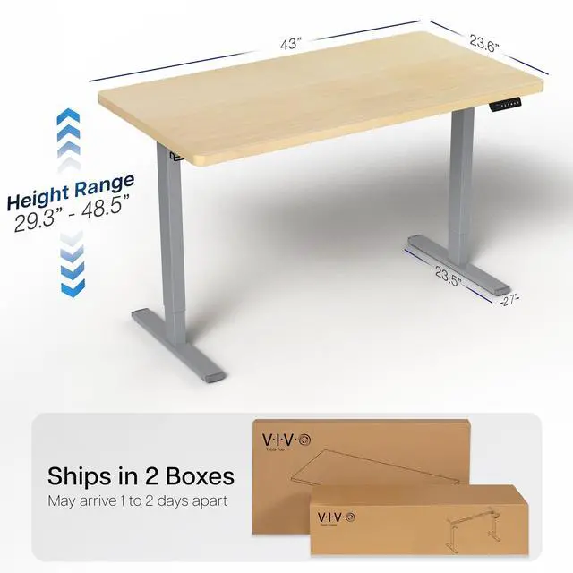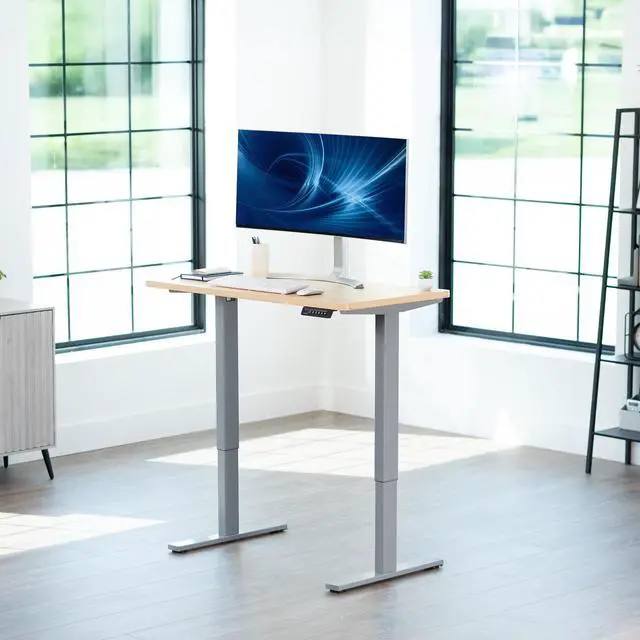 Transform your workstation to accommodate an active work life with the Light Wood / Gray 43 x 24 Electric Desk (DESK-KIT-1G4C) from VIVO! Finding a healthy balance between sitting and standing throughout the long work day is made possible with electric height adjustment, telescopic legs, and a simple push button controller featuring 4 memory presets. The space-efficient table top provides room for dual monitor setups and important supplies so you can organize your workspace to fit your preferred layout. With a frame constructed of solid steel, this desk supports up to 220 lbs and is built to last. Cable management clips keep cords and cables neatly organized and hidden from view for a tidy workspace that encourages concentration. All hardware and instructions are provided, so you can get your new workstation assembled and experience your very own standing desk in no time!