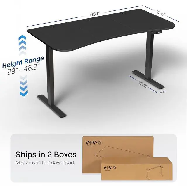 Transform your workstation to accommodate an active work life with the Black 63" x 32" Electric Desk (DESK-KIT-1B1B) from VIVO! Find that healthy balance between sitting and standing throughout the long work day with electric height adjustment, telescopic legs, and a simple push-button controller featuring 4 memory presets. With a frame constructed of solid steel, this desk supports up to 220 lbs and is built to last. The table top comes packaged in 3 sections, and all hardware is provided to get your desk frame put together and installed to your desktop in no time!