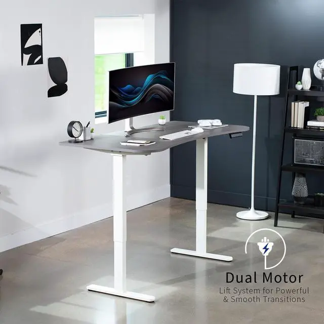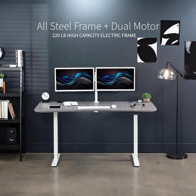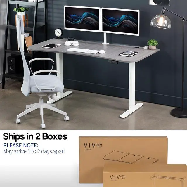 Transform your workstation to accommodate an active work life with the Dark Gray / White 63" x 32" Dual Motor Electric Desk (DESK-KIT-E2W1G) from VIVO! Find that healthy balance between sitting and standing throughout the long work day with electric height adjustment, telescopic legs, and a simple push-button controller featuring 3 memory presets. With a frame constructed of solid steel, this desk supports up to 220 lbs and is built to last. The table top comes packaged in 3 sections, and all hardware is provided to get your desk frame put together and installed to your desktop in no time!