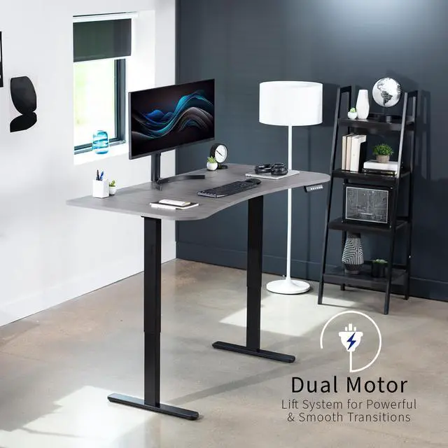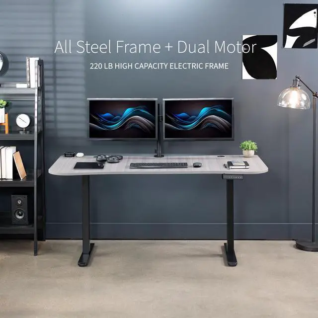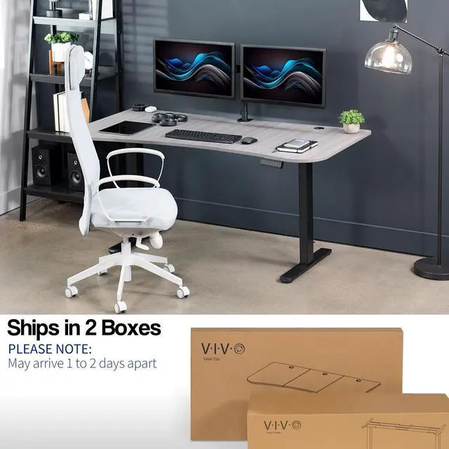Transform your workstation to accommodate an active work life with the Dark Gray / Black 63" x 32" Dual Motor Electric Desk (DESK-KIT-E2B1G) from VIVO! Find that healthy balance between sitting and standing throughout the long work day with electric height adjustment, telescopic legs, and a simple push-button controller featuring 3 memory presets. With a frame constructed of solid steel, this desk supports up to 220 lbs and is built to last. The table top comes packaged in 3 sections, and all hardware is provided to get your desk frame put together and installed to your desktop in no time!