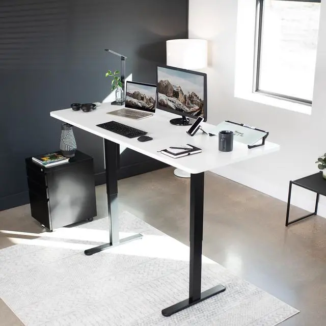 Transform your workstation to accommodate an active work life with the White / Black 71" x 30" Electric Desk (DESK-KIT-0B7W) from VIVO! Finding a healthy balance between sitting and standing throughout the long work day is made possible with electric height adjustment, telescopic legs, and a simple 2 button control panel. The spacious table top provides room for dual monitor setups and important supplies so you can organize your workspace to fit your preferred layout. With a frame constructed of solid steel, this desk supports up to 154 lbs and is built to last. All hardware and instructions are provided, so you can get your new workstation assembled and taking you to new heights!