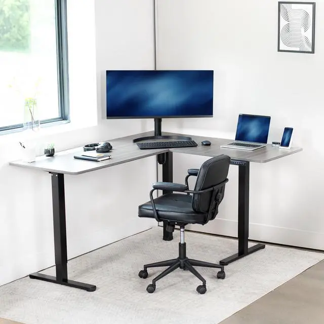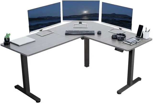 Enjoy a spacious workstation that accommodates an active work life with the Gray / Black 63" x 55" Corner Electric Desk (DESK-E3CTG) from VIVO! Periodically standing throughout the long work day can help relieve tension on the neck, back, and shoulders, as well as increase blood flow and reduce stress. Enjoy being able to stand up in seconds with this sturdy l-shaped desk featuring a single motor lift system for smooth height transitions, memory control panel for customizable settings, and solid legs supporting up to 176 lbs. All hardware and instructions are provided for assembly, so you can experience your own spacious work area that helps you stay organized and think on your feet!