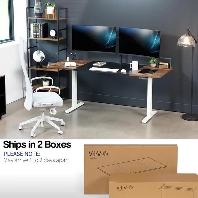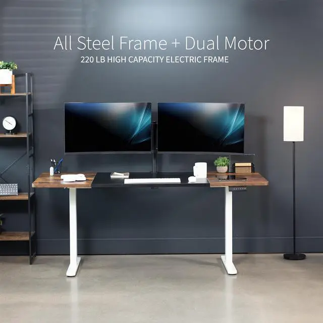 Transform your workstation to accommodate an active work life with the Black & Vintage Brown / White 71" x 30" Dual Motor Electric Desk (DESK-KIT-E2W7BN) from VIVO! Finding a healthy balance between sitting and standing throughout the long work day is made possible with electric height adjustment, telescopic legs, and a push-button control panel featuring 3 memory presets. The spacious, extra-deep table top provides room for multi-monitor setups and important supplies so you can organize your workspace to fit your preferred layout. With a frame constructed of solid steel, this desk supports up to 220 lbs and is built to last. All hardware and instructions are provided, so you can get your new workstation assembled and taking you to new heights!