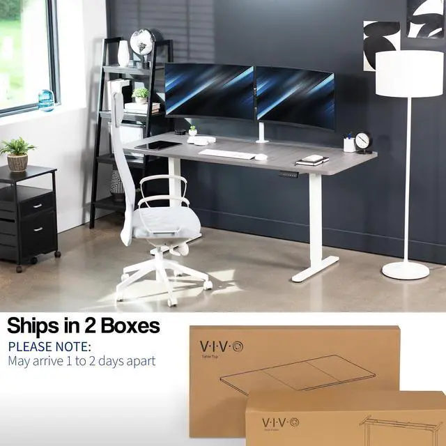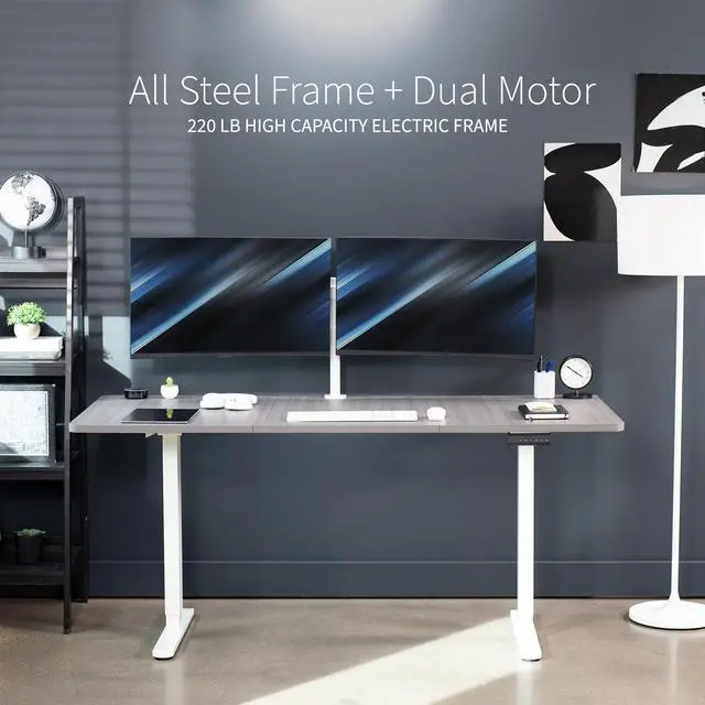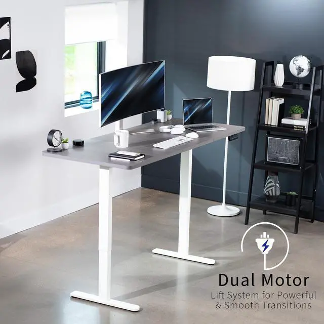 Transform your workstation to accommodate an active work life with the Dark Gray / White 71" x 30" Dual Motor Electric Desk (DESK-KIT-E2W7G) from VIVO! Finding a healthy balance between sitting and standing throughout the long work day is made possible with electric height adjustment, telescopic legs, and a push-button control panel featuring 3 memory presets. The spacious, extra-deep table top provides room for multi-monitor setups and important supplies so you can organize your workspace to fit your preferred layout. With a frame constructed of solid steel, this desk supports up to 220 lbs and is built to last. All hardware and instructions are provided, so you can get your new workstation assembled and taking you to new heights!