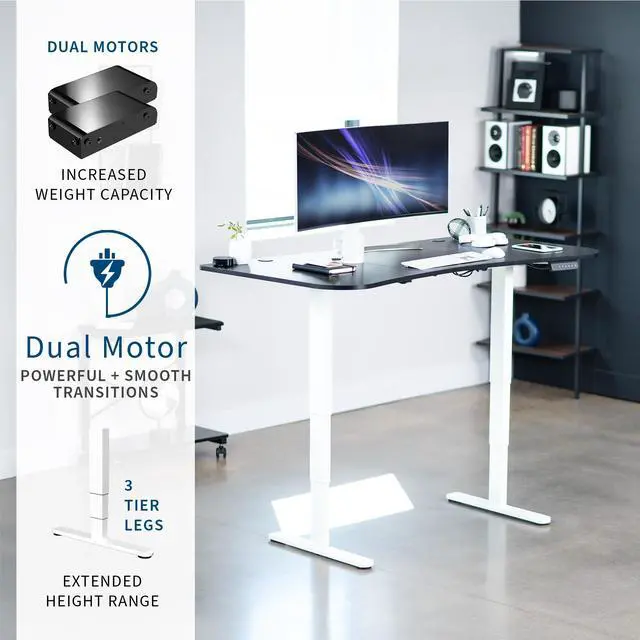 Transform your workstation to accommodate an active work life with the Black Carbon Fiber / White 63" x 32" Electric Desk (DESK-KIT-2W1R) from VIVO! Find that healthy balance between sitting and standing throughout the long work day with smooth height adjustment, powerful dual motors, and a simple push-button controller featuring 3 memory presets. With a frame constructed of solid steel, this desk supports up to 220 lbs when connected to a power source. The table top comes packaged in 3 sections, and all hardware is provided to get your desk frame put together and installed to your desktop in no time!
