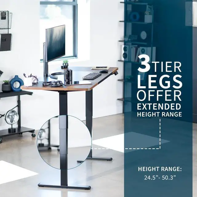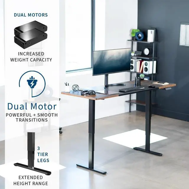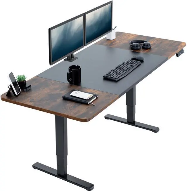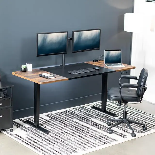 Transform your workstation to accommodate an active work life with the Black & Vintage Brown / Black 71" x 30" Electric Desk (DESK-KIT-2B7BN) from VIVO! Finding a healthy balance between sitting and standing throughout the long work day is made possible with electric height adjustment, telescopic legs, and a simple push-button controller featuring 3 memory presets. The spacious table top provides room for dual monitor setups and important supplies so you can organize your workspace to fit your preferred layout. With a frame constructed of solid steel, this desk supports up to 220 lbs and is built to last. All hardware and instructions are provided, so you can get your new workstation assembled and taking you to new heights!