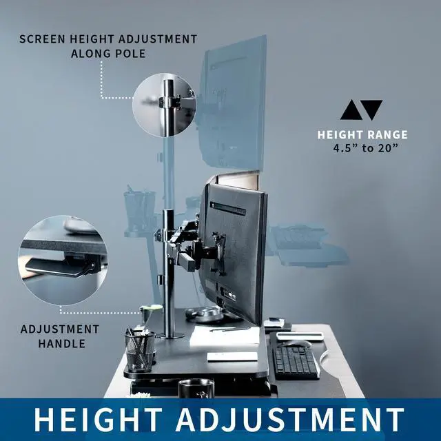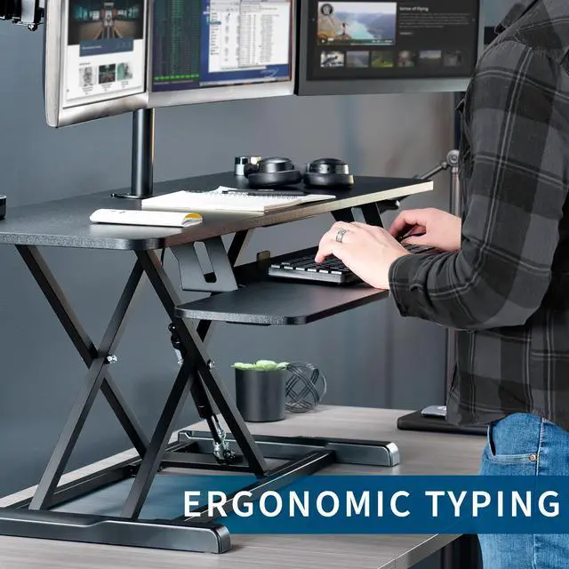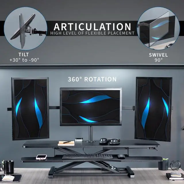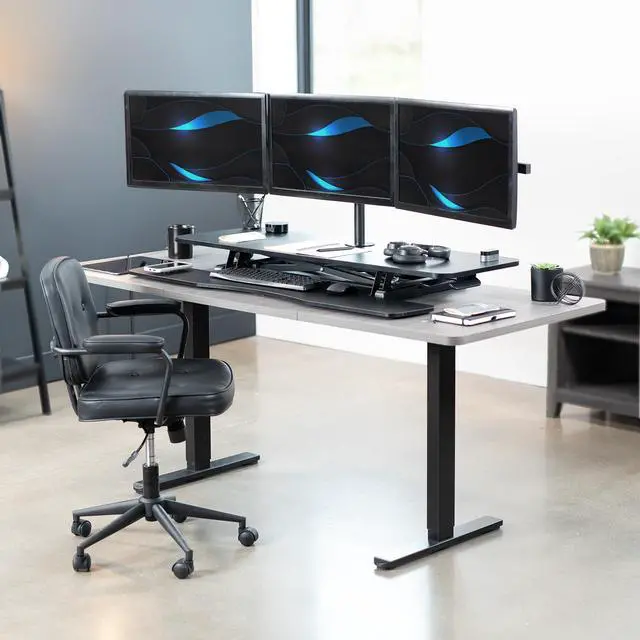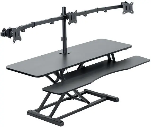 Create your own active workstation with the Extra Large Black Desk Riser with Triple Monitor Mount (DESK-KIT-48KB3C) from VIVO! Transitioning between sitting and standing throughout the long work day increases productivity and eases tension. This solidly built desk riser allows you to make height transitions at the squeeze of a handle, and the triple monitor stand attaches to your riser via sturdy grommet mount for additional height adjustment options and comfortable viewing angles. All hardware and instructions are provided so you can get your new desk riser and monitor stand assembled in no time!