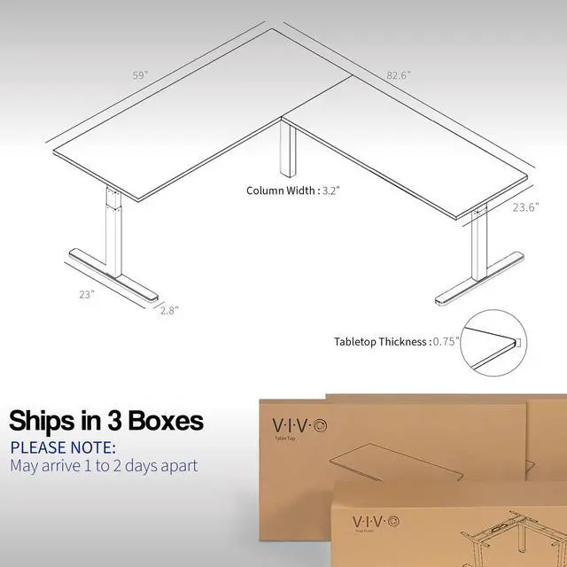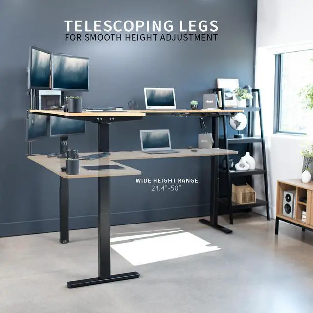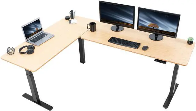 Enjoy a spacious workstation that accommodates an active work life with the Bamboo / Black Corner 83" x 60" Electric Desk (DESK-KIT-3E8BO) from VIVO! Periodically standing throughout the long work day can help relieve tension on the neck, back, and shoulders, as well as increase blood flow and reduce stress. Enjoy being able to stand up in seconds with this sturdy l-shaped desk featuring a multi-motor lift system for smooth height transition, a control panel for customizable settings, and solid legs supporting up to 300 lbs. The cable management system ensures that cords and cables are neatly organized for a tidy workspace that encourages concentration. All hardware and instructions are included for assembly. Dont wait to experience your own spacious work area that helps you stay organized and think on your feet!