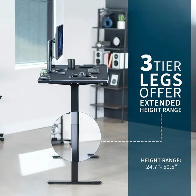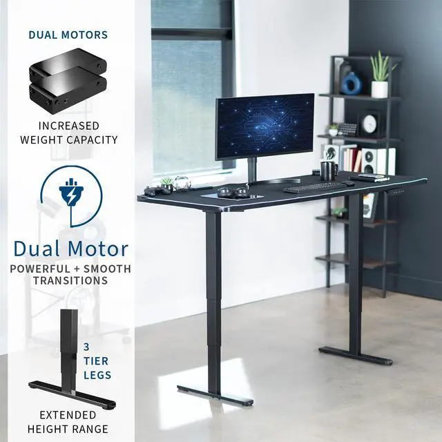 Transform your workstation to accommodate an active work life with the Black 71" x 30" Electric Desk with RGB Pad (DESK-KIT-2B7BP) from VIVO! Finding a healthy balance between sitting and standing throughout the long work day is made possible with electric height adjustment, telescopic legs, and a simple push-button controller featuring 3 memory presets. The spacious table top provides room for dual monitor setups and important supplies so you can organize your workspace to fit your preferred layout. The full-size RGB pad features 12 color modes with 8 vibrant solid colors and 4 mesmerizing motion effects to create the perfect ambiance. With a frame constructed of solid steel, this desk supports up to 220 lbs and is built to last. All hardware and instructions are provided, so you can get your new workstation assembled and taking you to new heights!