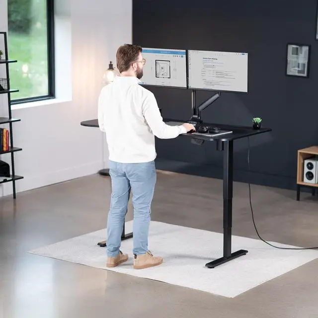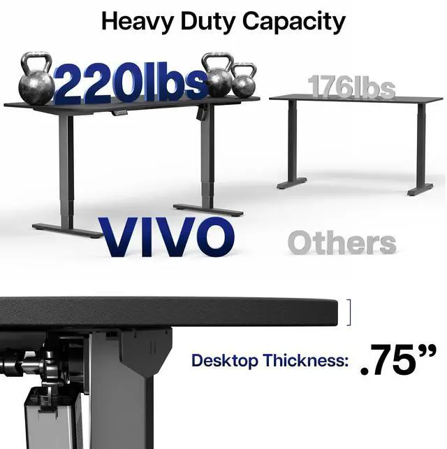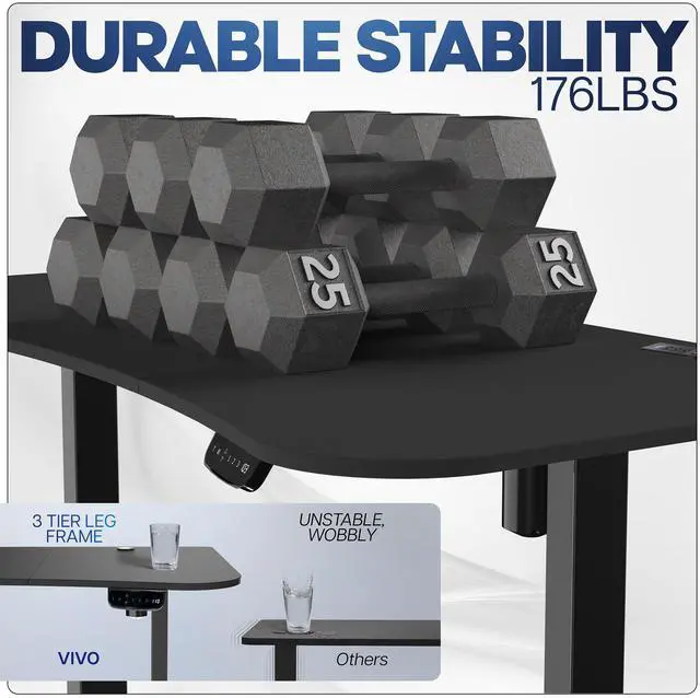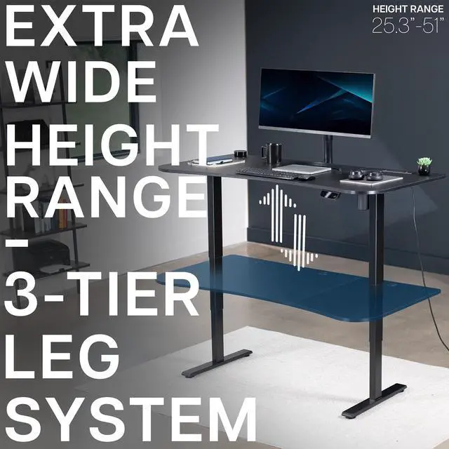 Transform your workstation to accommodate an active work life with the Black 63 x 32 Electric Desk with Built-in Power Strip (DESK-KIT-2EBAC) from VIVO! Find that healthy balance between sitting and standing throughout the long work day with electric adjustment, 3-stage telescopic legs for extra height, a built-in power strip for device charging, and an elegant touch-screen controller featuring memory presets. With a frame constructed of solid steel, this desk supports up to 220 lbs and is built to last. The table top has a curved, modern shape with a cable management opening and comes packaged in 3 sections. All hardware is provided to get the desk frame put together and installed to the desktop in no time!