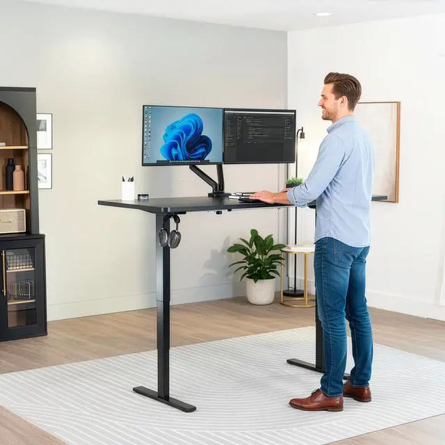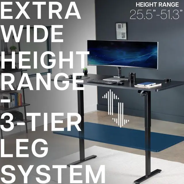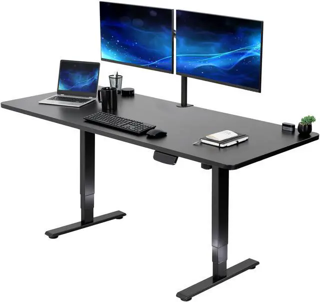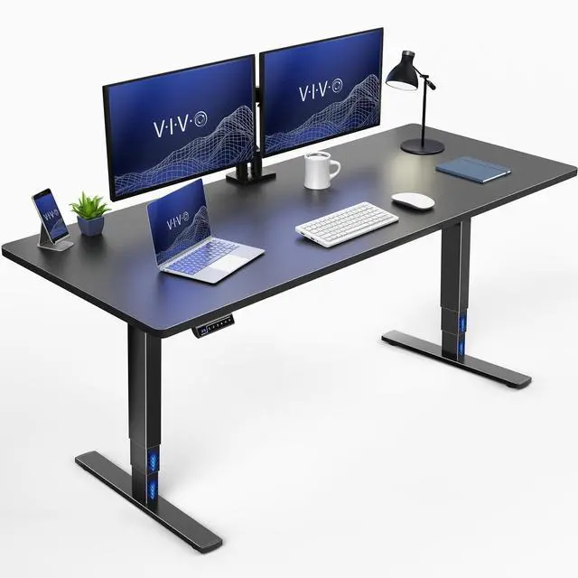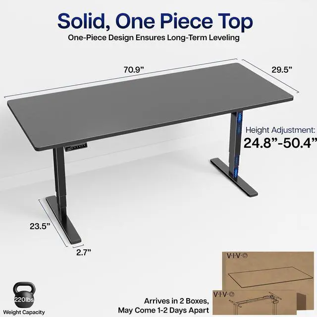 Transform your workstation to accommodate an active work life with the Black 71" x 30" Electric Desk (DESK-KIT-2E71B) from VIVO! Finding a healthy balance between sitting and standing throughout the long work day is made possible with electric height adjustment, 3-stage telescopic legs, and an elegant touch-screen control panel. The spacious, solid table top provides room for dual-monitor setups and important supplies so you can organize your workspace to fit your preferred layout. With a frame constructed of solid steel, this desk supports up to 220 lbs and is built to last. The integrated cable management system ensures that cords and cables are neatly organized and hidden from view for a tidy workspace. All hardware and instructions are provided, so you can get your new workstation assembled and taking you to new heights!