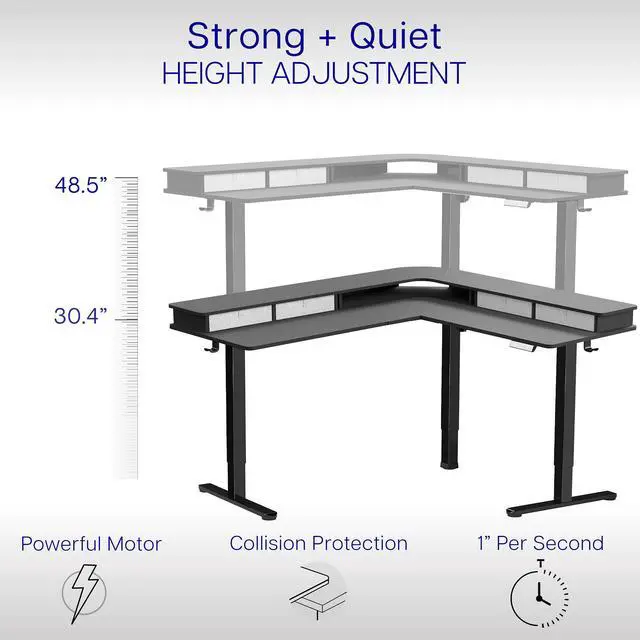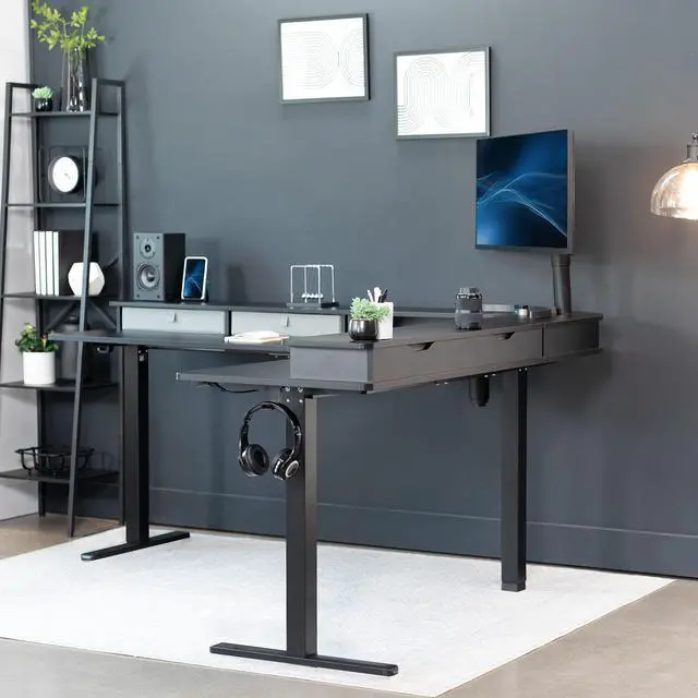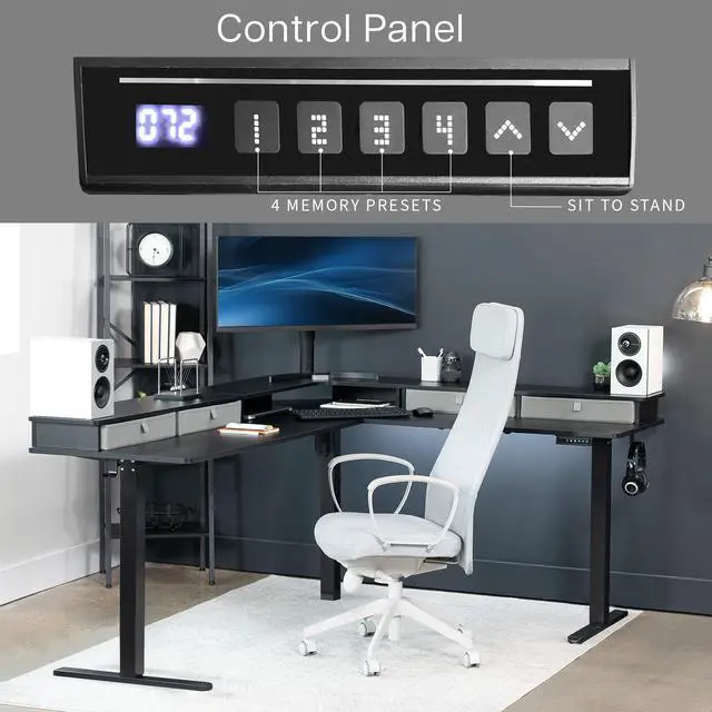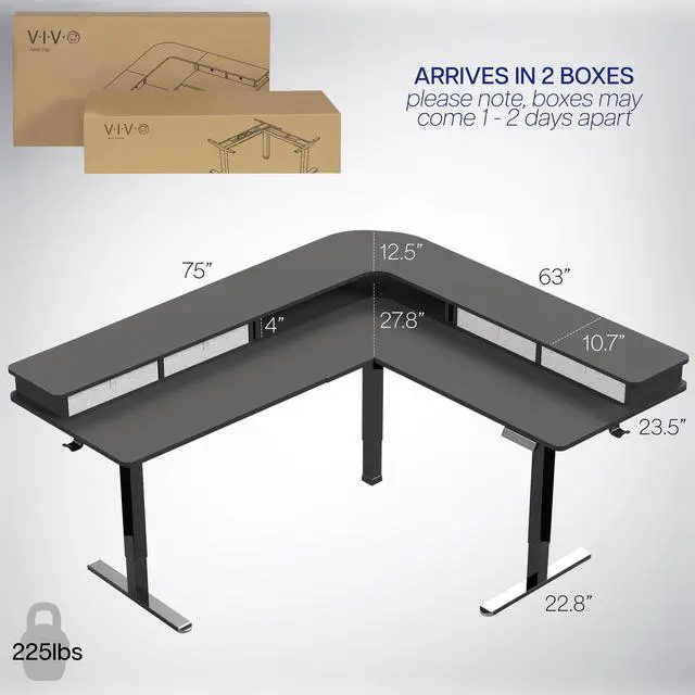 Enjoy an active work life with the Black 2 Tier 75" x 63" Corner Electric Desk with Storage (DESK-E3CVB-75) from VIVO! The innovative 2-tier design will change the way you work, with a spacious layout and convenient storage. Set the main desktop at your preferred typing height, and place your monitors on the top surface for ergonomic screen viewing. Finding a healthy balance between sitting and standing throughout the long work day is made possible with an electric motor, telescopic legs, and a simple push-button memory controller. Durable casters provide smooth mobility on a variety of floor types and are lockable when you want your corner desk to be stationary. All hardware and instructions are provided, so you can get your new active workstation assembled and taking you to new heights!