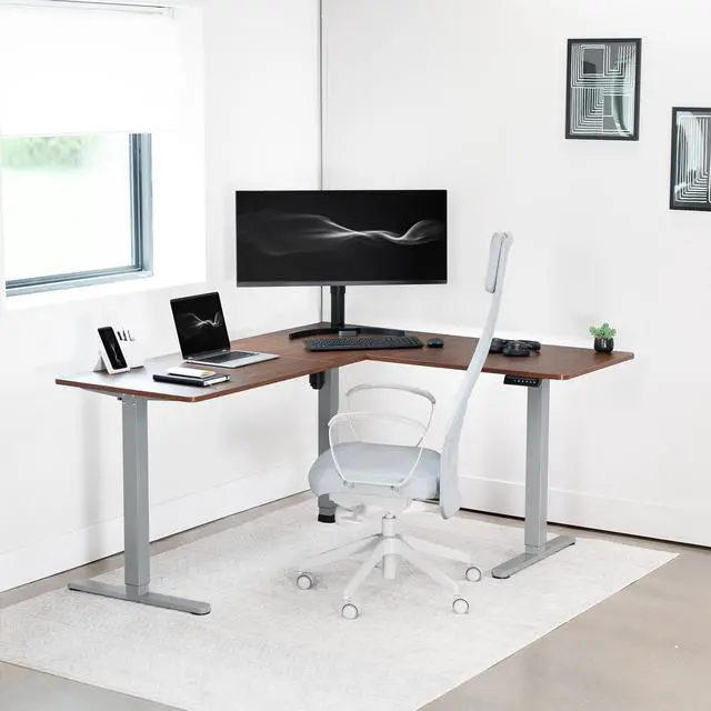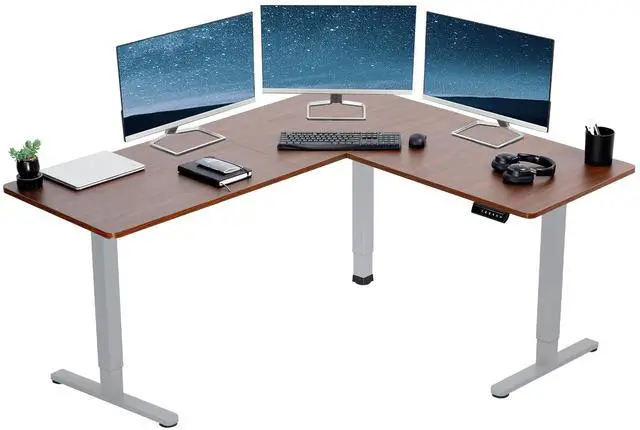 Enjoy a spacious workstation that accommodates an active work life with the Dark Walnut / Gray 63" x 55" Corner Electric Desk (DESK-E3CTGD) from VIVO! Periodically standing throughout the long work day can help relieve tension on the neck, back, and shoulders, as well as increase blood flow and reduce stress. Enjoy being able to stand up in seconds with this sturdy l-shaped desk featuring a single motor lift system for smooth height transitions, memory control panel for customizable settings, and solid legs supporting up to 176 lbs. All hardware and instructions are provided for assembly, so you can experience your own spacious work area that helps you stay organized and think on your feet!
