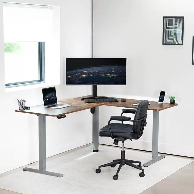 Enjoy a spacious workstation that accommodates an active work life with the Vintage Brown / Gray 63" x 55" Corner Electric Desk (DESK-E3CTGN) from VIVO! Periodically standing throughout the long work day can help relieve tension on the neck, back, and shoulders, as well as increase blood flow and reduce stress. Enjoy being able to stand up in seconds with this sturdy l-shaped desk featuring a single motor lift system for smooth height transitions, memory control panel for customizable settings, and solid legs supporting up to 176 lbs. All hardware and instructions are provided for assembly, so you can experience your own spacious work area that helps you stay organized and think on your feet!