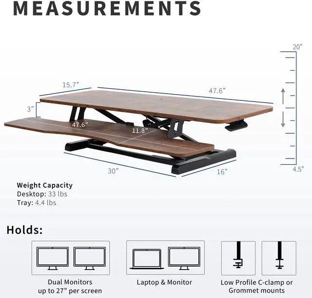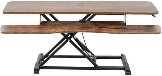Enhance your work experience with the Vintage Brown / Black 48 Desk Riser (DESK-V048KN) from VIVO! Transitioning between sitting and standing throughout the long work day provides numerous benefits such as increased blood flow and reduced tension. The solidly built desktop supports up to 33 lbs, easily holding multiple monitors or laptop and monitor combinations. It also features pneumatic spring lift that allows simple and smooth height adjustment at the squeeze of a handle. The dual-tiered design lets you customize your work area to create the workflow you need, and the keyboard tray is removable using the provided hex tool. All hardware and instructions are provided so you can get your new desk riser assembled in no time!
