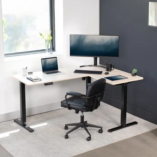 Enjoy a spacious workstation that accommodates an active work life with the Light Wood / Black 63 x 47 Corner Electric Desk (DESK-E3CTC-47) from VIVO! Periodically standing throughout the long work day can help relieve tension on the neck, back, and shoulders, as well as increase blood flow and reduce stress. Enjoy being able to stand up in seconds with this sturdy l-shaped desk featuring a single motor lift system for smooth height transitions, memory control panel for customizable settings, and solid legs supporting up to 176 lbs. All hardware and instructions are provided for assembly, so you can experience your own spacious work area that helps you stay organized and think on your feet!