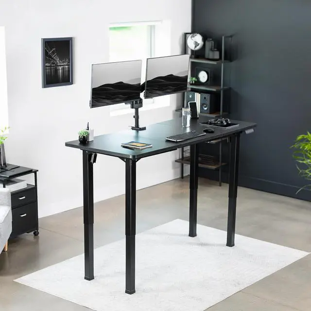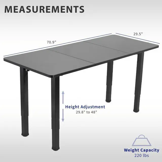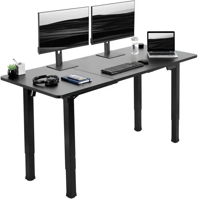 Transform your workstation to accommodate an active work life with the Black 71" x 30" Dual Motor Electric 4-Leg Desk (DESK-KIT-E4BB) from VIVO! Finding a healthy balance between sitting and standing throughout the long work day is made possible with electric height adjustment, four telescopic legs, and a simple push-button controller featuring memory presets. The spacious desktop provides room for multi-monitor displays and important supplies to create a comfortable computer workstation. With a 4-leg frame constructed of solid steel and sturdy particle board top, this desk supports up to 220 lbs. All hardware and instructions are provided, so you can get your new workstation assembled and enjoy this sleek, modern standing desk in no time!