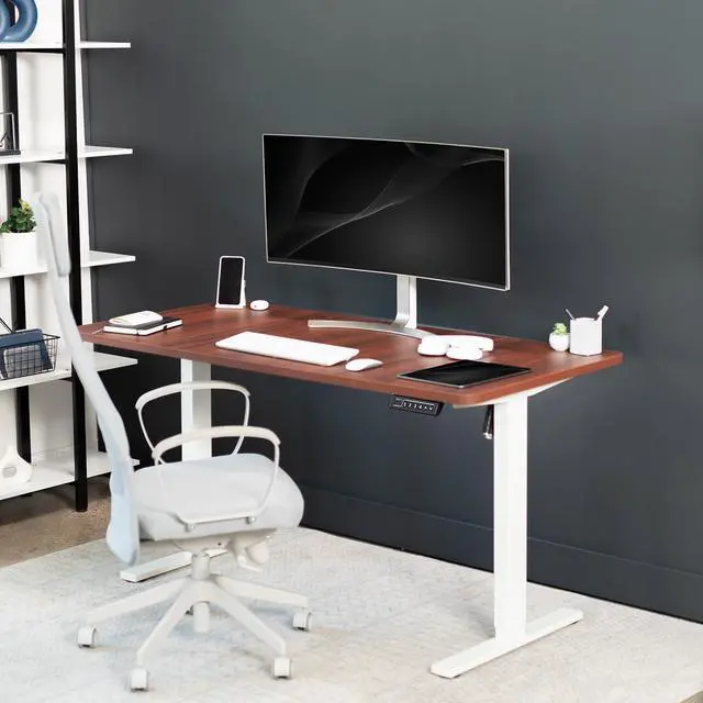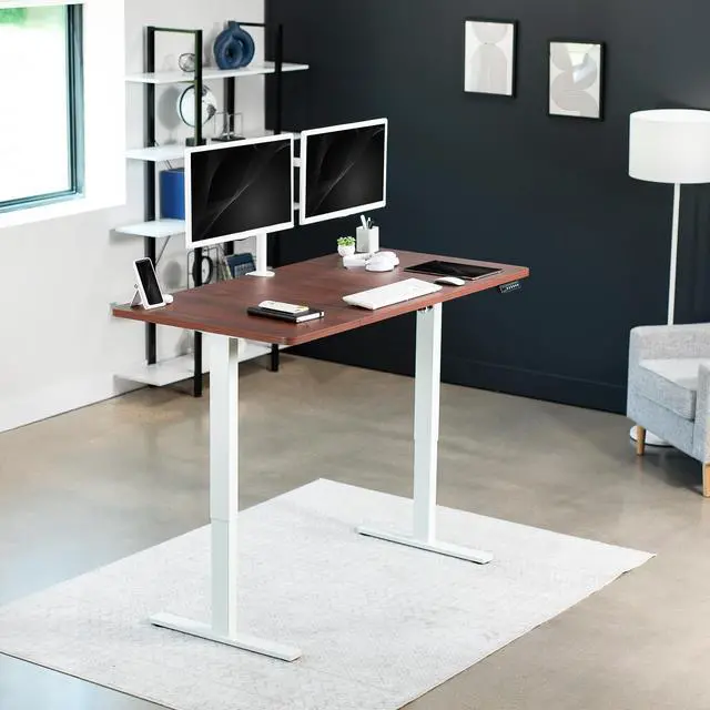 Transform your workstation to accommodate an active work life with the Dark Walnut / White 60" x 30" Electric Desk (DESK-KIT-1W6D-30) from VIVO! Finding a healthy balance between sitting and standing throughout the long work day is made possible with electric height adjustment, telescopic legs, and a memory control panel. The spacious table top provides room for dual monitor setups and important supplies so you can organize your workspace to fit your preferred layout. With a frame constructed of solid steel, this desk supports up to 176 lbs and is built to last. All hardware and instructions are provided, so you can get your new workstation assembled and taking you to new heights!