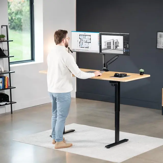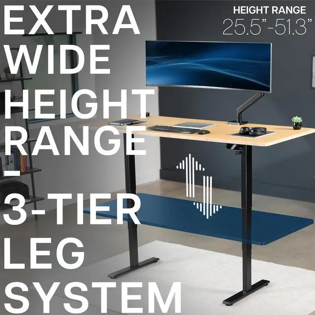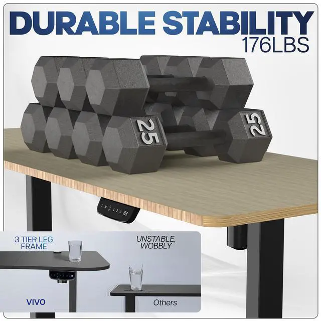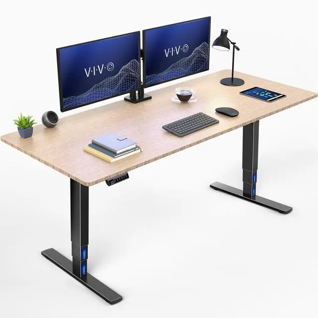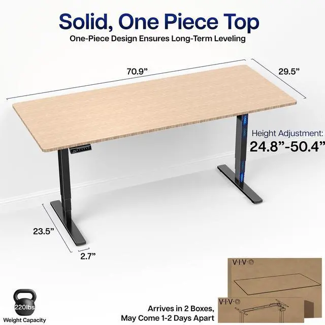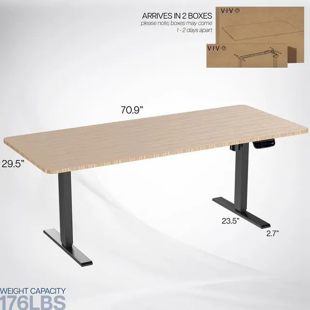 Transform your workstation to accommodate an active work life with the Bamboo / Black 71" x 30" Electric Desk (DESK-KIT-2E71O) from VIVO! Finding a healthy balance between sitting and standing throughout the long work day is made possible with electric height adjustment, 3-stage telescopic legs, and an elegant touch-screen control panel. The spacious, solid bamboo table top provides room for dual-monitor setups and important supplies so you can organize your workspace to fit your preferred layout. With a frame constructed of solid steel, this desk supports up to 220 lbs and is built to last. The integrated cable management system ensures that cords and cables are neatly organized and hidden from view for a tidy workspace. All hardware and instructions are provided, so you can get your new workstation assembled and taking you to new heights!