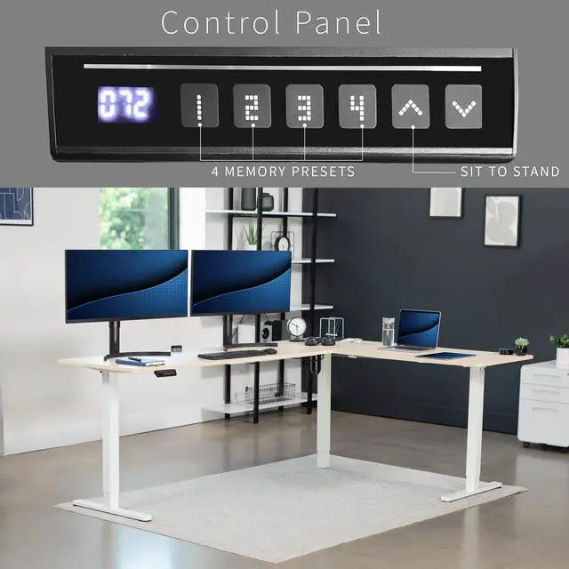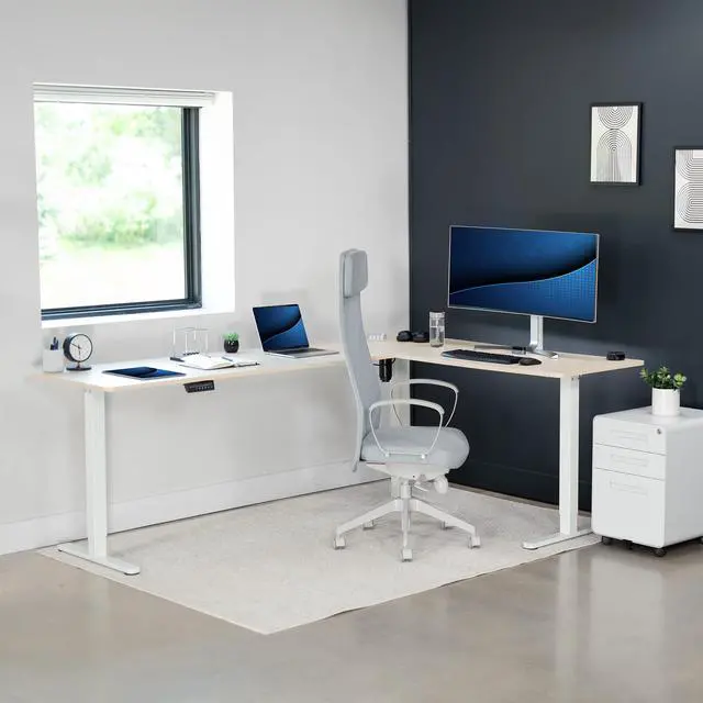 Enjoy a spacious workstation that accommodates an active work life with the Light Wood / White 84" x 63" Corner Electric Desk (DESK-E3CTWC-84) from VIVO! Periodically standing throughout the long work day can help relieve tension on the neck, back, and shoulders, as well as increase blood flow and reduce stress. Enjoy being able to stand up in seconds with this sturdy l-shaped desk featuring a single motor lift system for smooth height transitions, memory control panel for customizable settings, and solid legs supporting up to 176 lbs. All hardware and instructions are provided for assembly, so you can experience your own spacious work area that helps you stay organized and think on your feet!