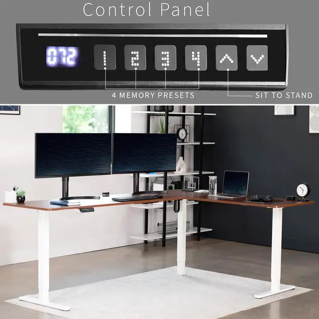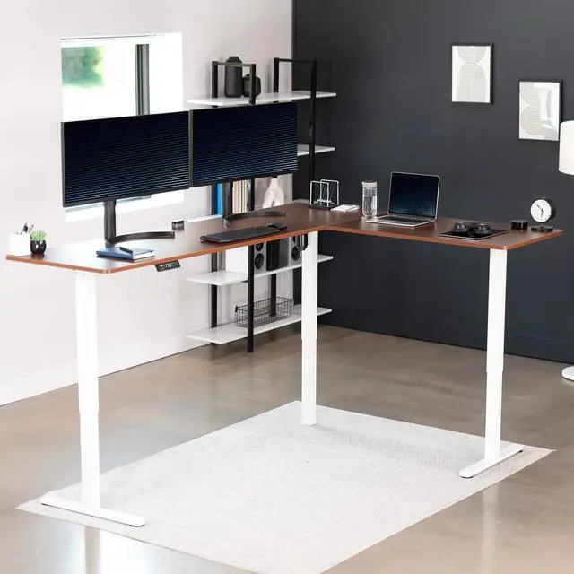 Enjoy a spacious workstation that accommodates an active work life with the Dark Walnut / White 84" x 63" Corner Electric Desk (DESK-E3CTWD-84) from VIVO! Periodically standing throughout the long work day can help relieve tension on the neck, back, and shoulders, as well as increase blood flow and reduce stress. Enjoy being able to stand up in seconds with this sturdy l-shaped desk featuring a single motor lift system for smooth height transitions, memory control panel for customizable settings, and solid legs supporting up to 176 lbs. All hardware and instructions are provided for assembly, so you can experience your own spacious work area that helps you stay organized and think on your feet!