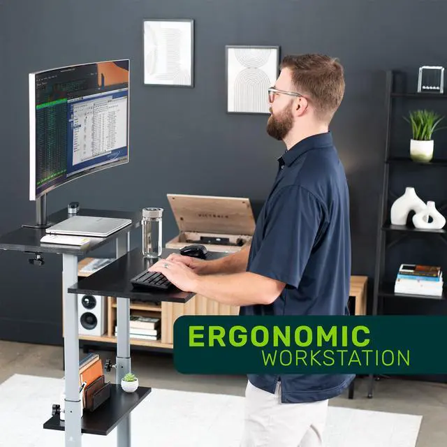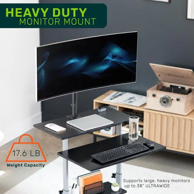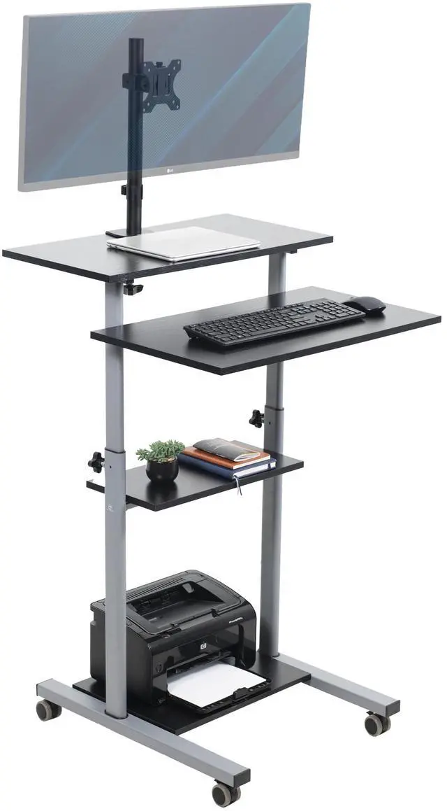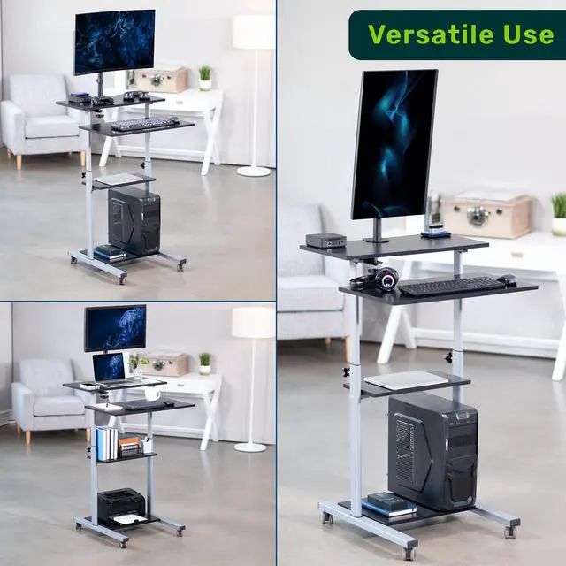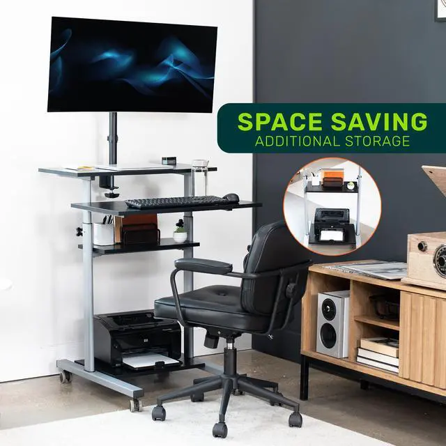 Enjoy true versatility with the Mobile Computer Workstation with Monitor Mount (OF-WS-KIT) from TechOrbits! This innovative computer workstation on wheels functions as a computer desk, standing desk, portable presentation lectern, and more! Work sitting or standing at home or away, and enjoy a comprehensive workstation holding everything from your monitor to your PC. Wheel this versatile desk from office to boardroom to trade show and lock it into place. Secure pin-locking height adjustment, articulating monitor mount, caster wheels, and four shelves make this compact desk indispensable wherever you use it.