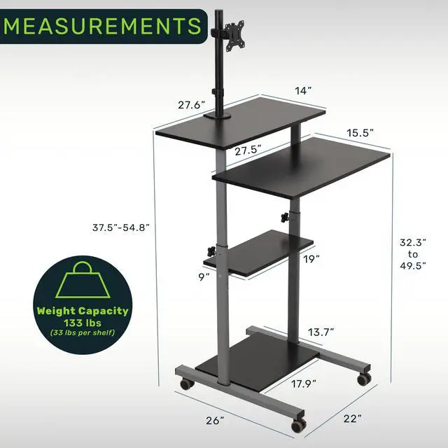- Cart Height Adjustment (Floor to Keyboard Shelf): 32.3 to 49.5