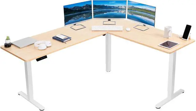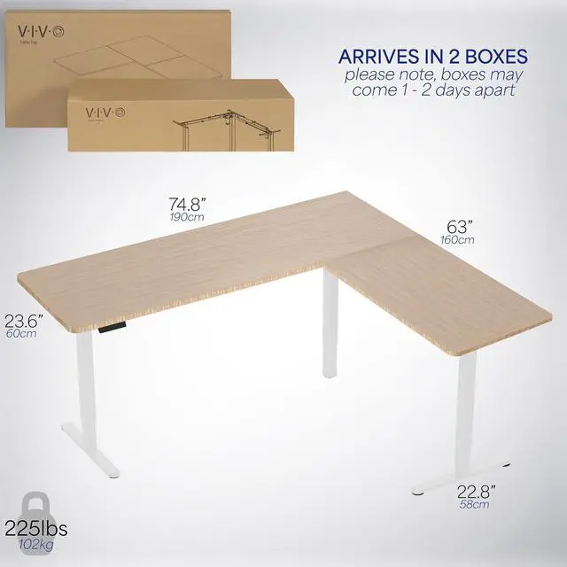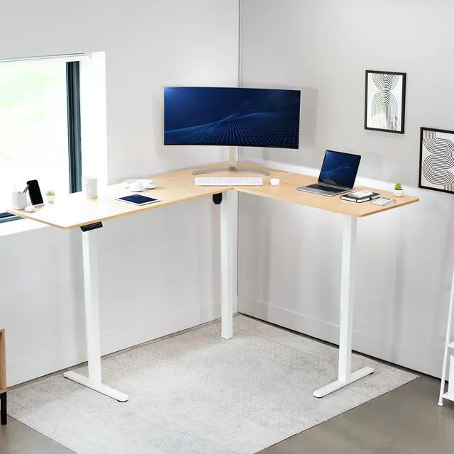 Enjoy a spacious workstation that accommodates an active work life with the Bamboo / White 75 x 63 Corner Electric Desk (DESK-E3CTWO-75) from VIVO! Periodically standing throughout the long work day can help relieve tension on the neck, back, and shoulders, as well as increase blood flow and reduce stress. Enjoy being able to stand up in seconds with this sturdy l-shaped desk featuring a single motor lift system for smooth height transitions, memory control panel for customizable settings, and solid legs supporting up to 176 lbs. All hardware and instructions are provided for assembly, so you can experience your own spacious work area that helps you stay organized and think on your feet!