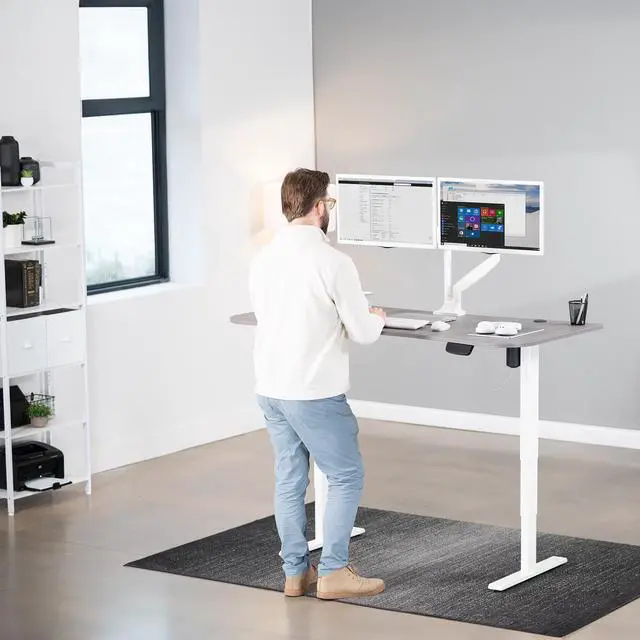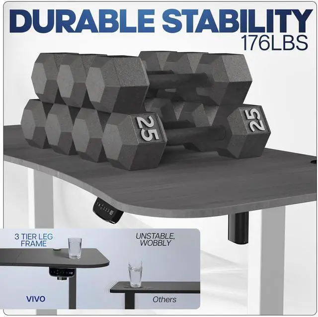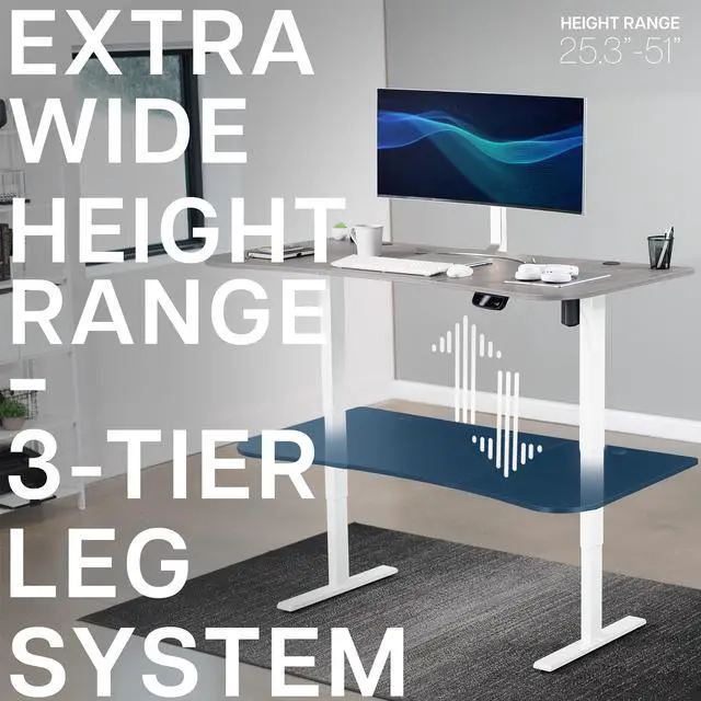 Transform your workstation to accommodate an active work life with the Dark Gray / White 63" x 32" Electric Desk (DESK-KIT-2EWG) from VIVO! Find that healthy balance between sitting and standing throughout the long work day with electric adjustment, 3-stage telescopic legs for extra height, and an elegant touch-screen controller featuring memory presets and a timer reminder. With a frame constructed of solid steel, this desk supports up to 176 lbs and is built to last. The table top has a curved, modern shape with cable management openings and comes packaged in 3 sections. All hardware is provided to get the desk frame put together and installed to the desktop in no time!