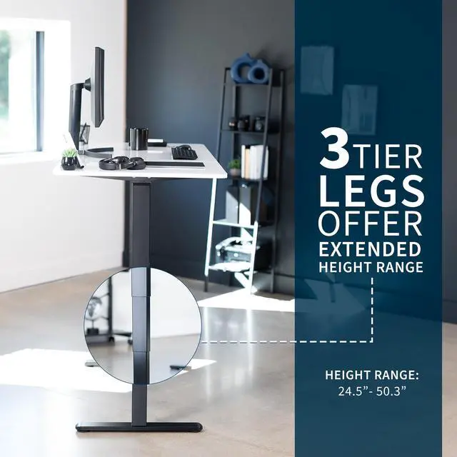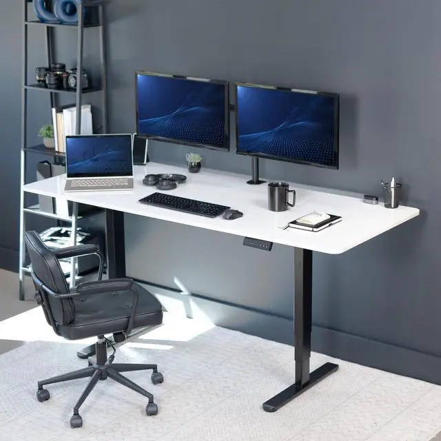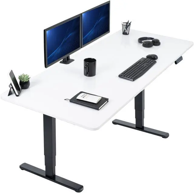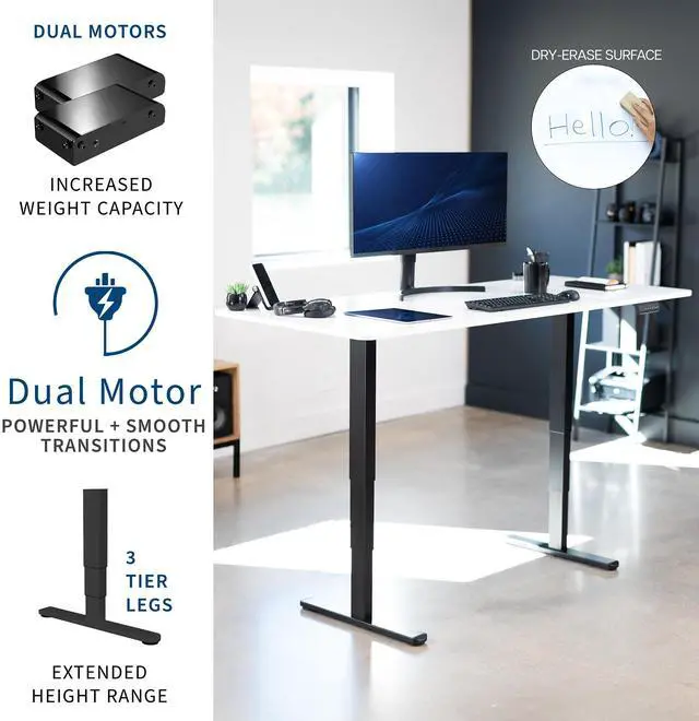 Transform your workstation to accommodate an active work life with the White Dry Erase / Black 71" x 30" Electric Desk (DESK-KIT-2B7WE) from VIVO! Finding a healthy balance between sitting and standing throughout the long work day is made possible with electric height adjustment, telescopic legs, and a simple push button controller featuring 3 memory presets. The spacious table top provides a sleek writing surface across the entire top, giving you plenty of space to sketch out ideas or take notes. With a frame constructed of solid steel, this desk supports up to 220 lbs and is built to last. All hardware and instructions are provided, so you can get your new workstation assembled and taking you to new heights!