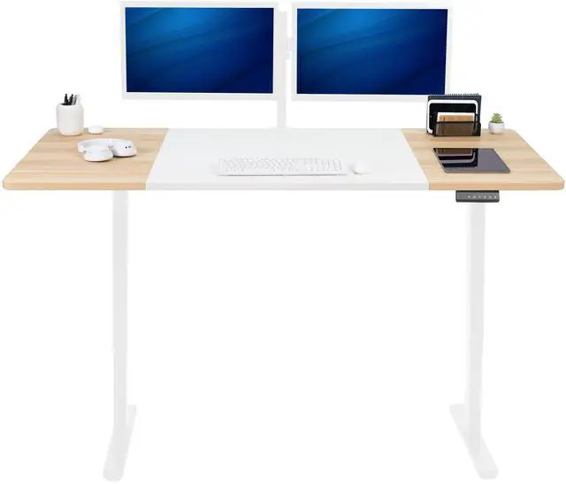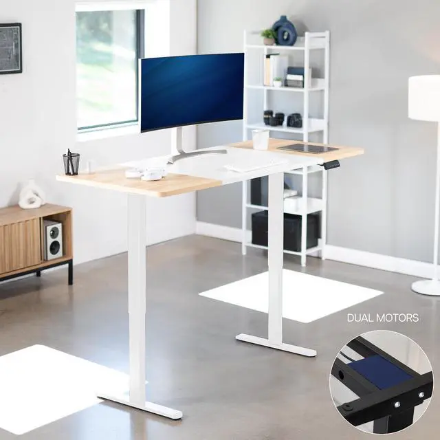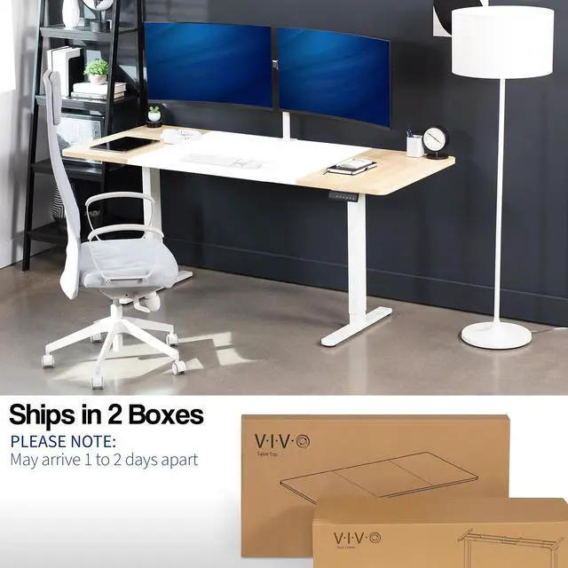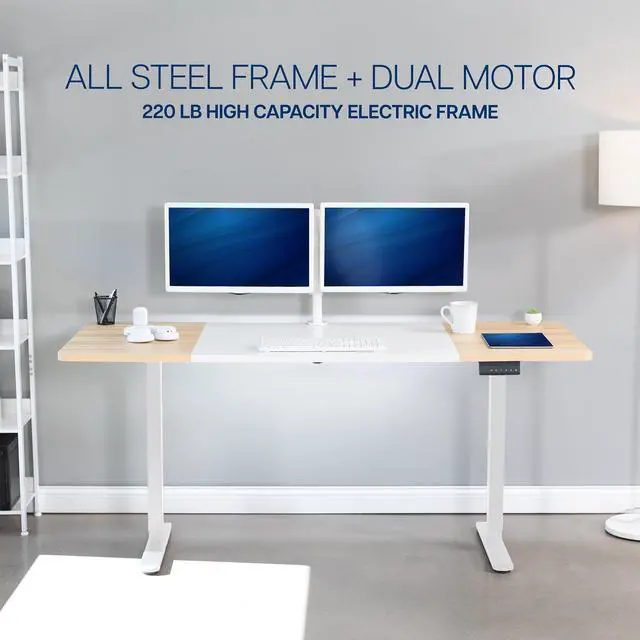 Transform your workstation to accommodate an active work life with the White & Light Wood / White 71" x 30" Dual Motor Electric Desk (DESK-KIT-E2W7WC) from VIVO! Finding a healthy balance between sitting and standing throughout the long work day is made possible with electric height adjustment, telescopic legs, and a push-button control panel featuring 3 memory presets. The spacious, extra-deep table top provides room for multi-monitor setups and important supplies so you can organize your workspace to fit your preferred layout. With a frame constructed of solid steel, this desk supports up to 220 lbs and is built to last. All hardware and instructions are provided, so you can get your new workstation assembled and taking you to new heights!