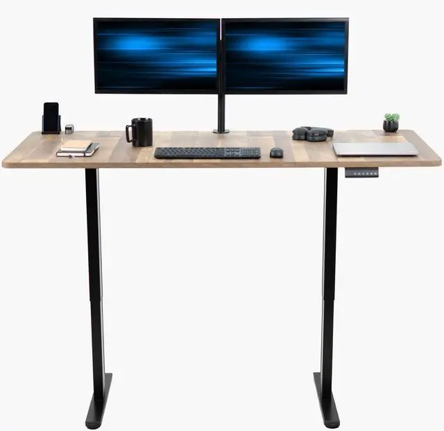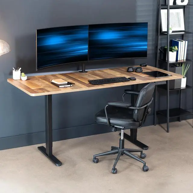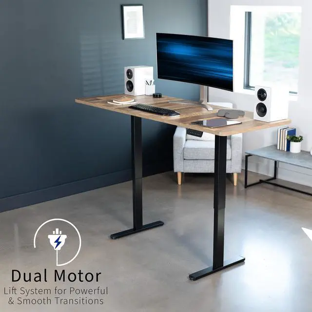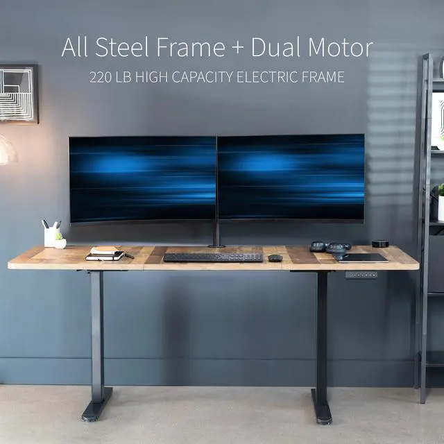 Transform your workstation to accommodate an active work life with the Reclaimed Wood / Black 71" x 30" Dual Motor Electric Desk (DESK-KIT-E2B7P) from VIVO! Finding a healthy balance between sitting and standing throughout the long work day is made possible with electric height adjustment, telescopic legs, and a push-button control panel featuring 3 memory presets. The spacious, extra-deep table top provides room for multi-monitor setups and important supplies so you can organize your workspace to fit your preferred layout. With a frame constructed of solid steel, this desk supports up to 220 lbs and is built to last. All hardware and instructions are provided, so you can get your new workstation assembled and taking you to new heights!