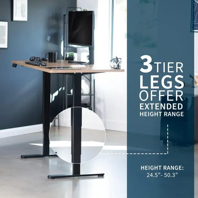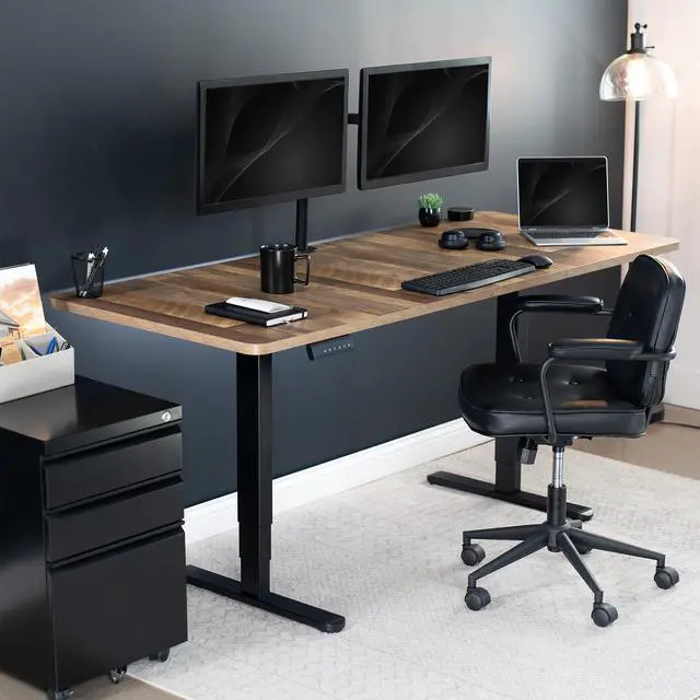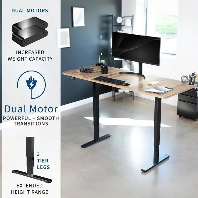 Transform your workstation to accommodate an active work life with the Reclaimed Wood / Black 71" x 30" Electric Desk (DESK-KIT-2B7P) from VIVO! Finding a healthy balance between sitting and standing throughout the long work day is made possible with electric height adjustment, telescopic legs, and a simple push button controller featuring 3 memory presets. The spacious table top provides room for dual monitor setups and important supplies so you can organize your workspace to fit your preferred layout. With a frame constructed of solid steel, this desk supports up to 220 lbs and is built to last. All hardware and instructions are provided, so you can get your new workstation assembled and taking you to new heights!